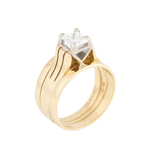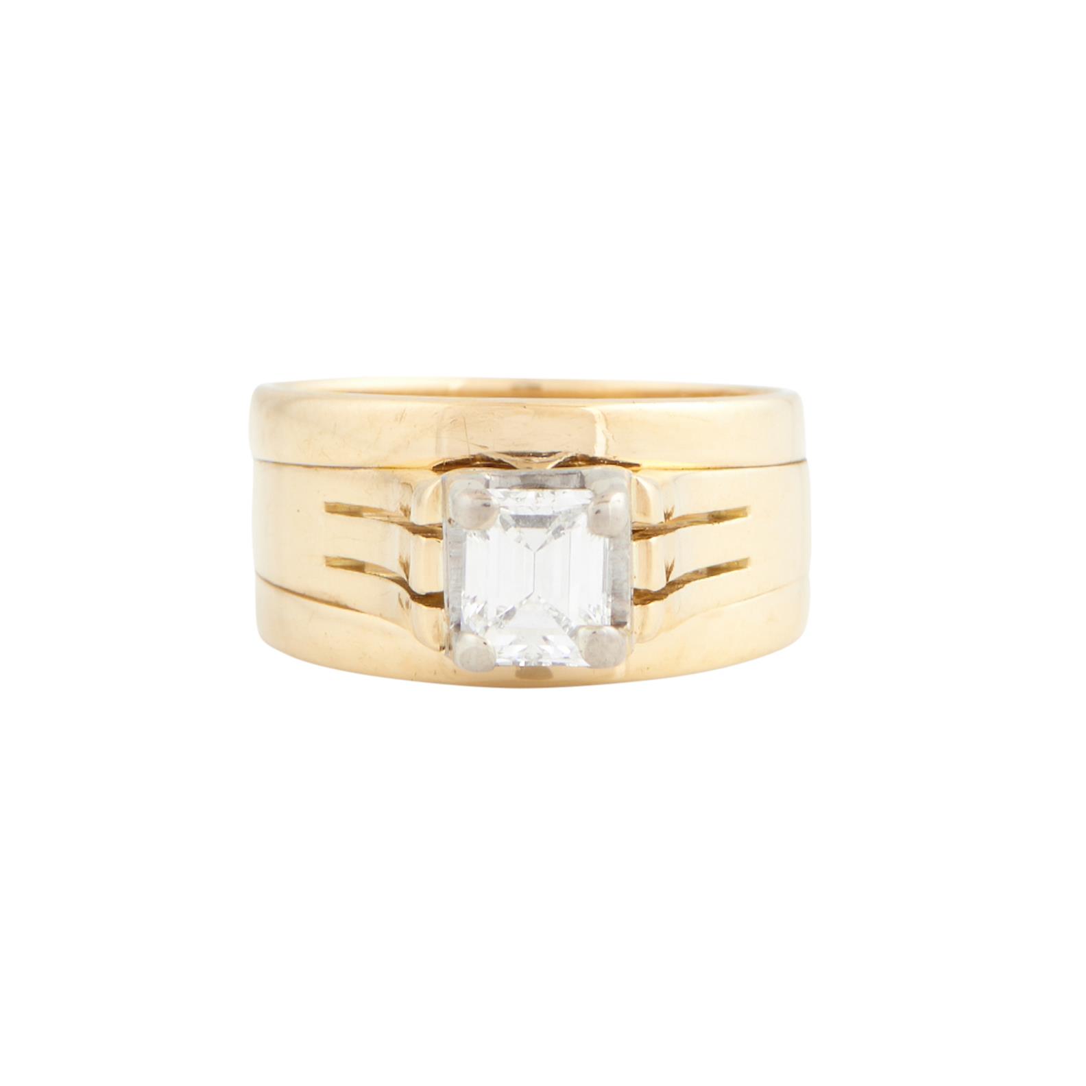 Centring a corner claw-set emerald-cut diamond weighing approximately 0.82 carats, size L.