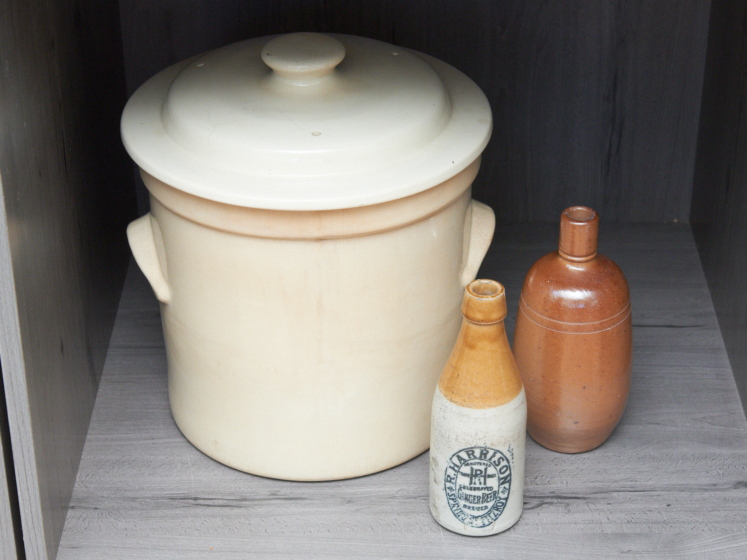 A COLLECTION OF ANTIQUE STONEWARE PIECES INCL. A LARGE BREAD BIN, A HARRISON GINGER BEER BOTTLE AND ANOTHER BOTTLE H.35CM (LARGEST) (A/F), LEONARD JOEL DELIVERY SIZE: LARGE