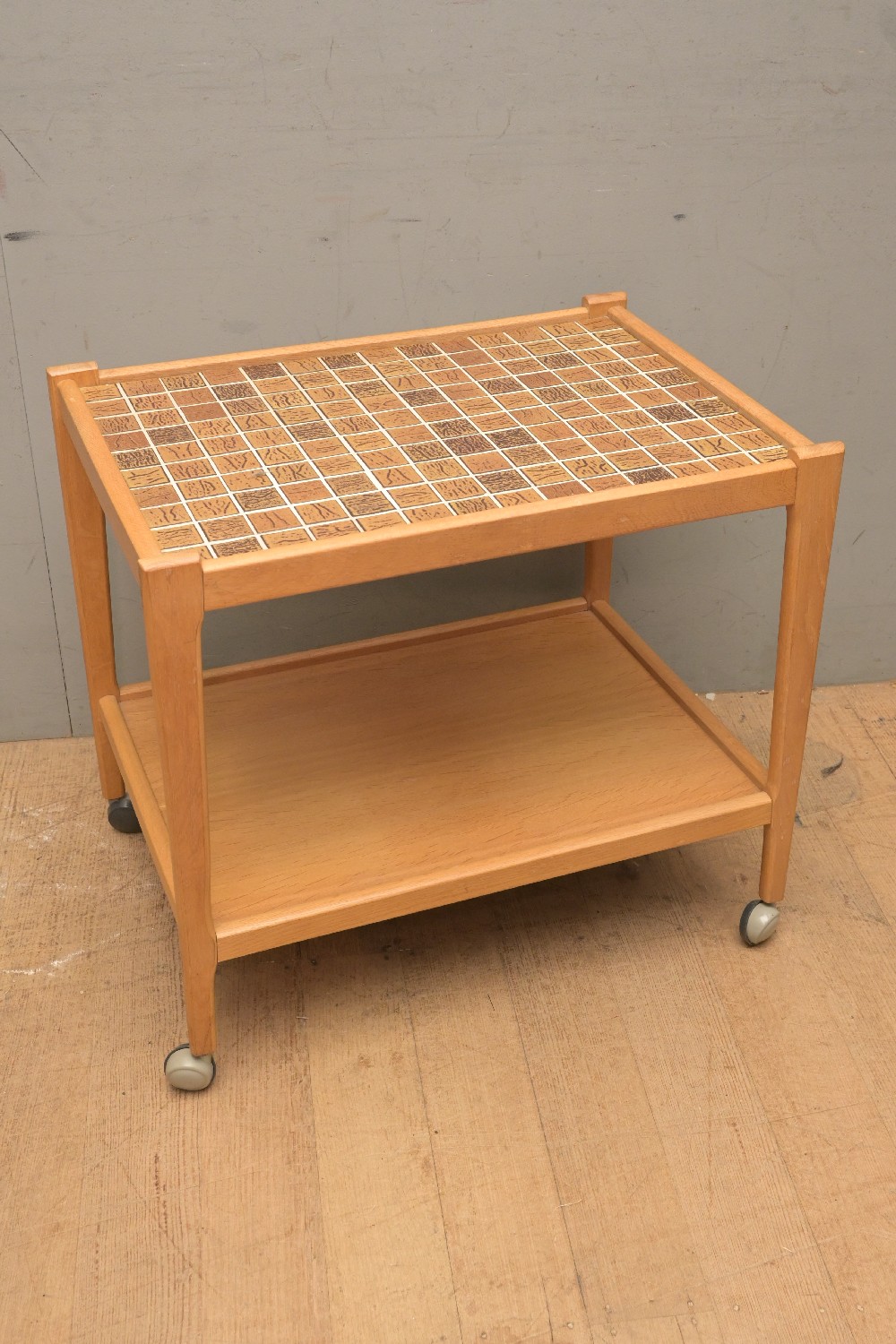 A 1960'S DANISH OAK TWO TIER AUTO TROLLEY WITH TILE TOP - SIGNS OF REPAIR (58H X 63W X 46D CM) (LEONARD JOEL DELIVERY SIZE: LARGE)