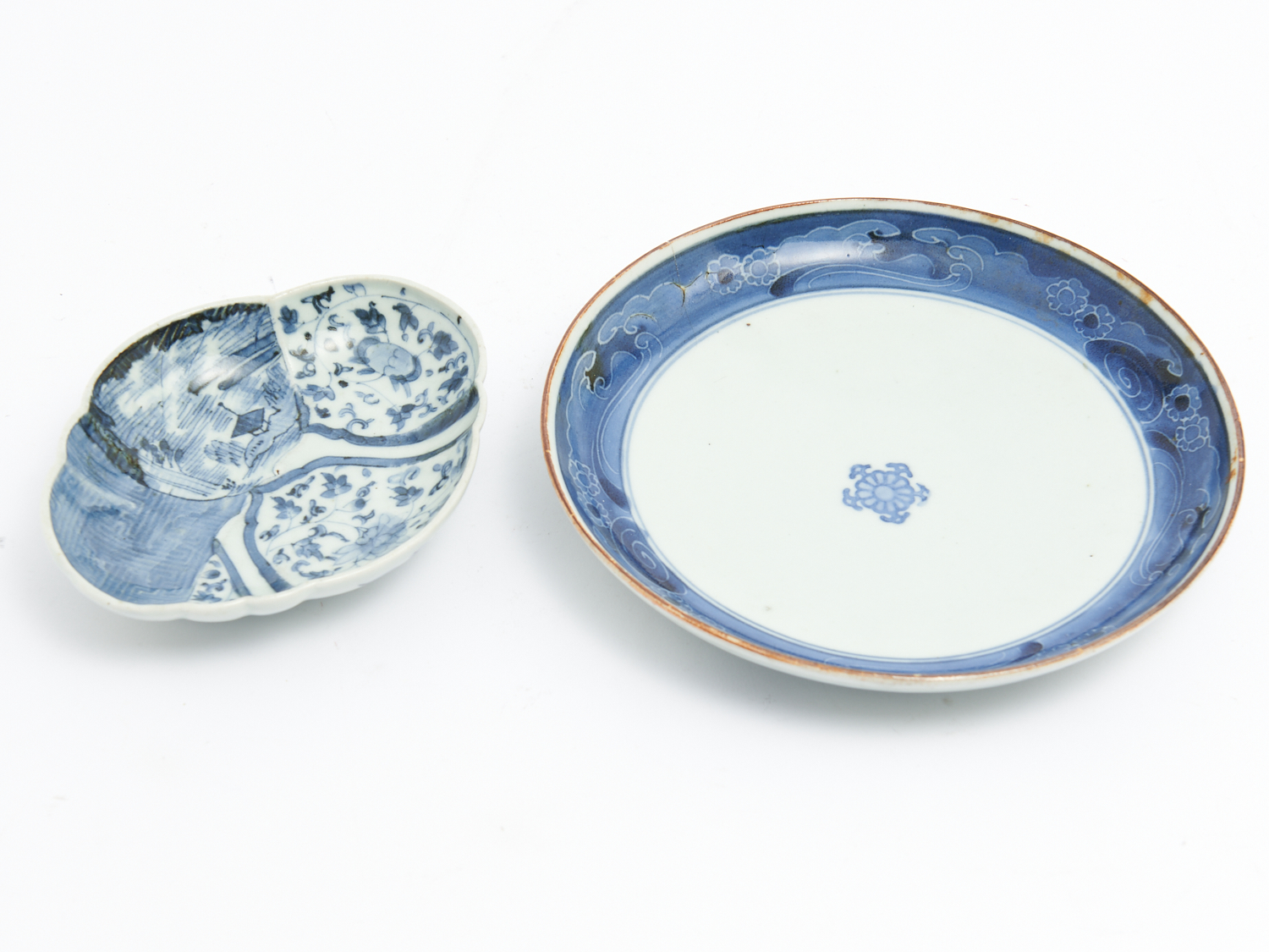 A JAPANESE BLUE AND WHITE INK RESIST STAMP DECORATED DISH AND AN ASYMMETRICALLY MOULDED DISH C.1690-1730 DIA.20.5CM (LARGEST), LEONARD JOEL DELIVERY SIZE: MEDIUM