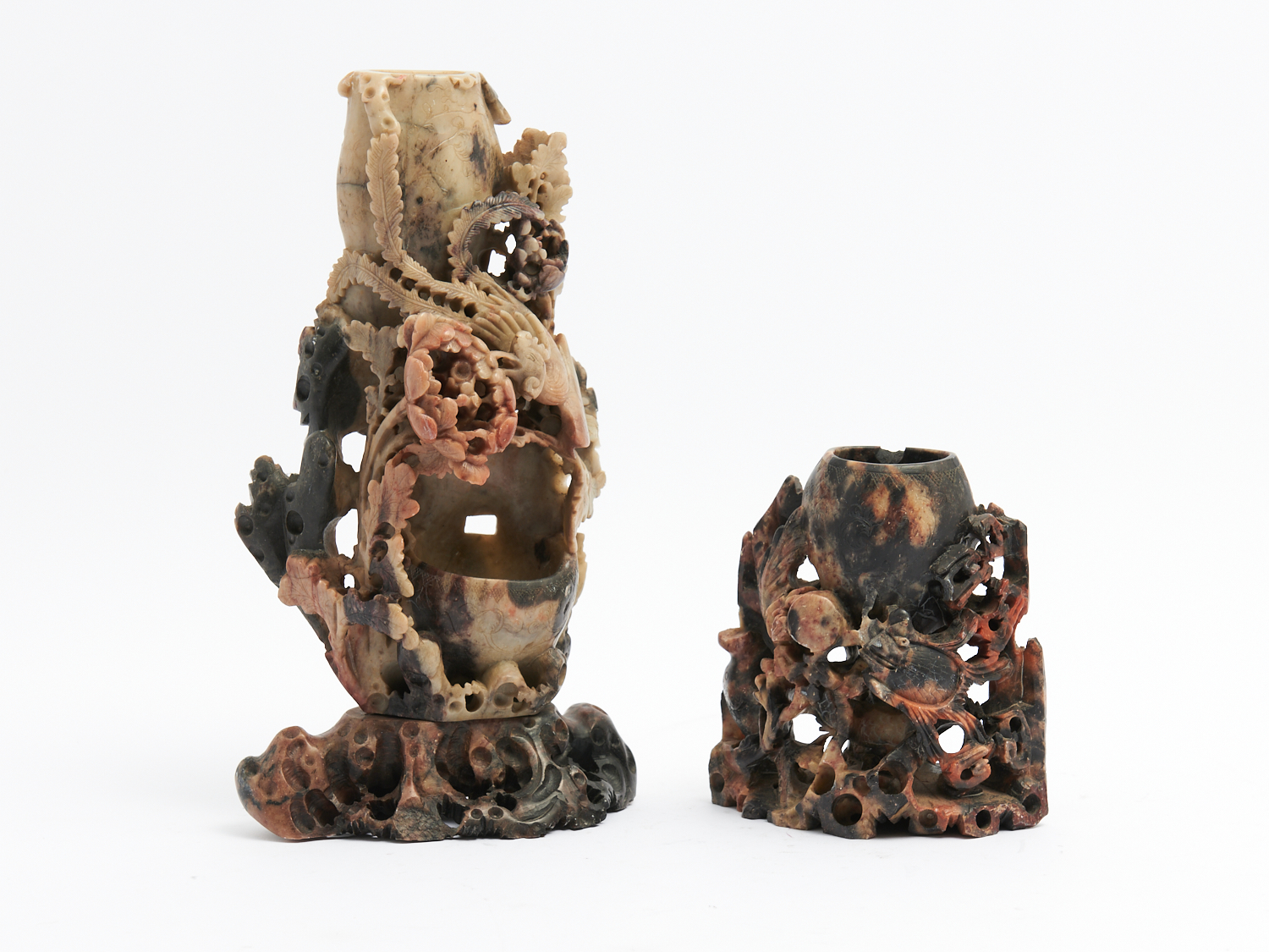 A PAIR OF CHINESE SOAPSTONE CARVINGS H.27.5CM (TALLEST) (A/F), LEONARD JOEL DELIVERY SIZE: MEDIUM
