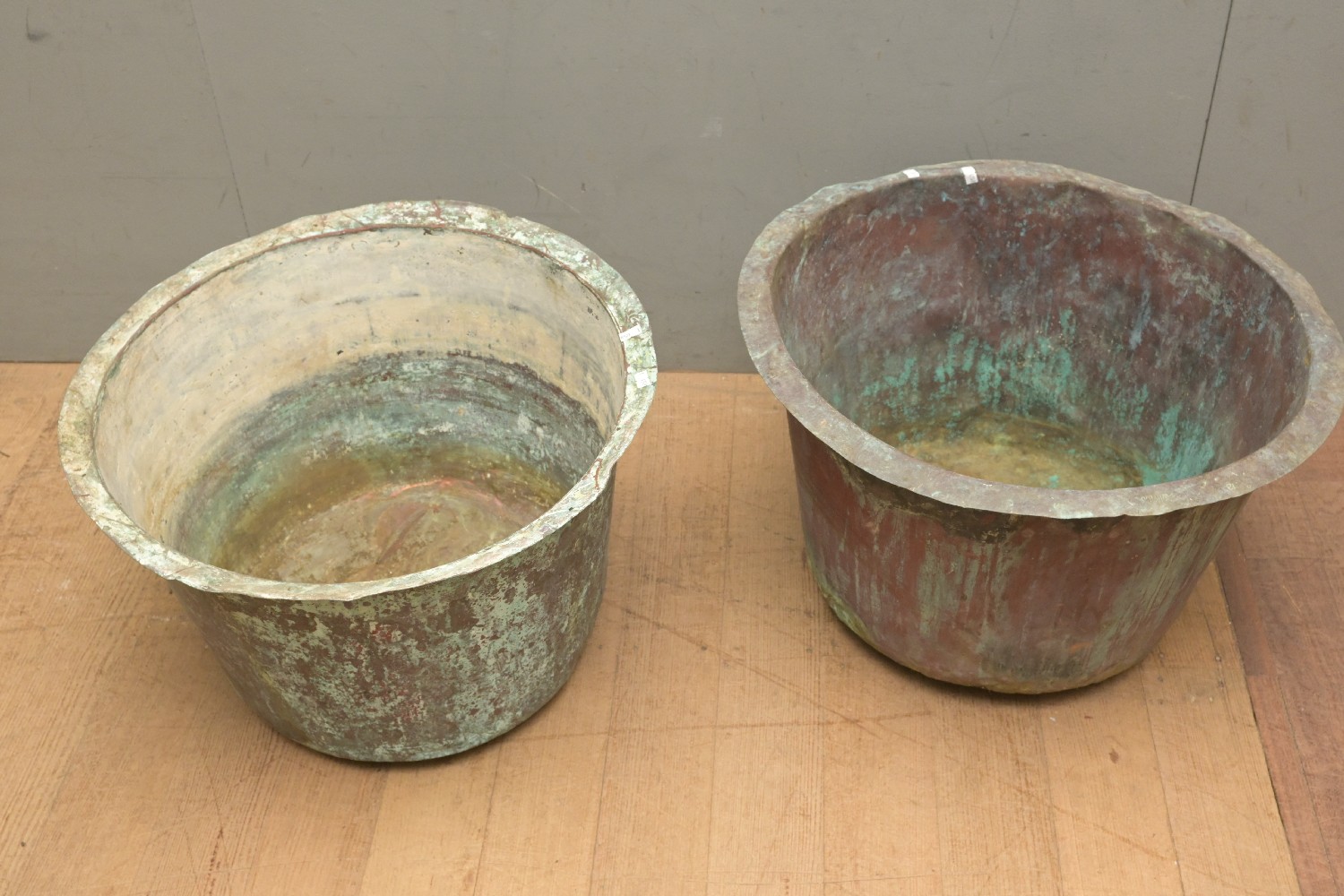 TWO LARGE COPPERS (A/F) (35H X 56DIAM CM) (LEONARD JOEL DELIVERY SIZE: LARGE)
