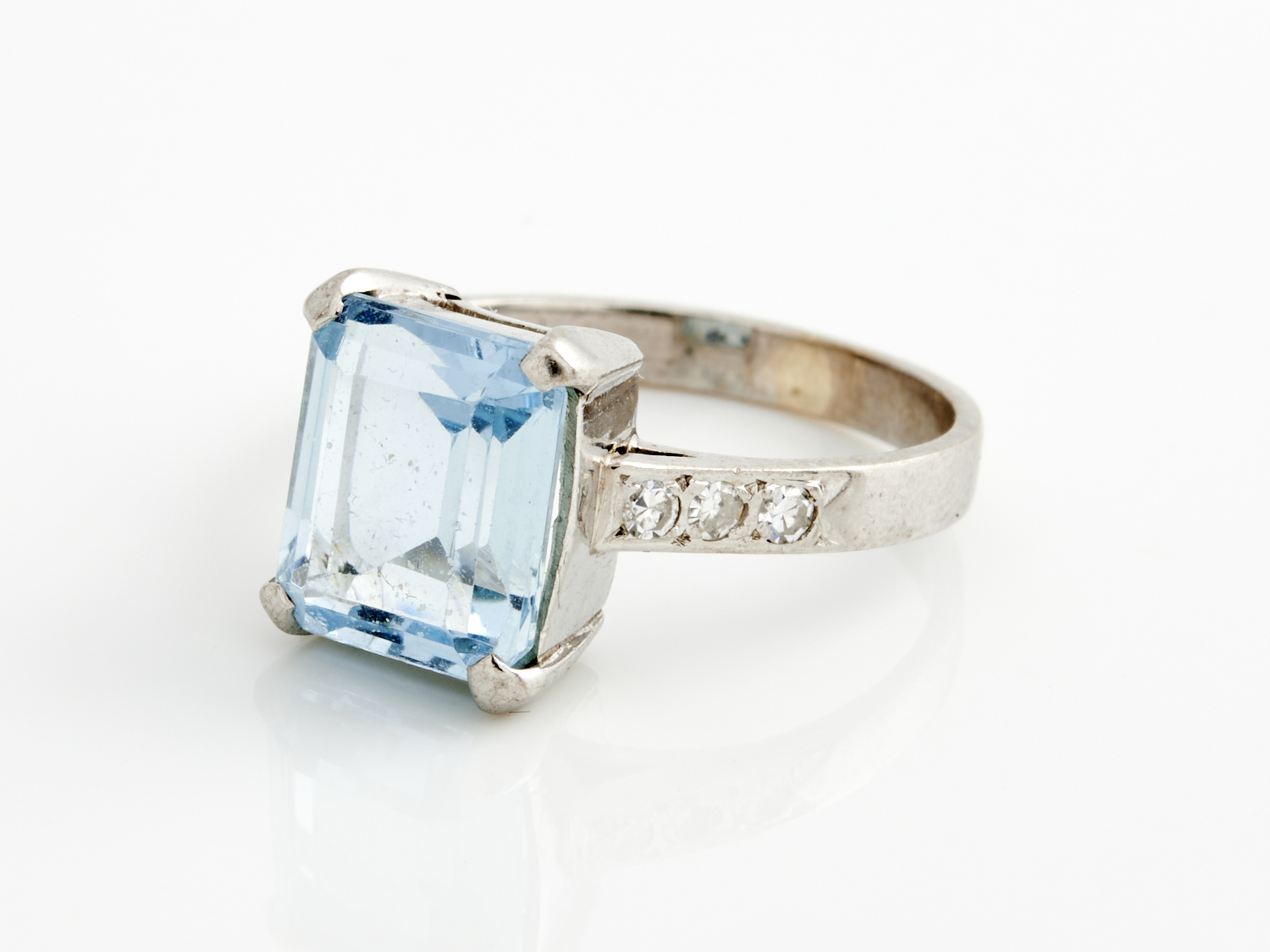 AN AQUAMARINE AND DIAMOND RING IN 18CT WHITE GOLD, SIZE K