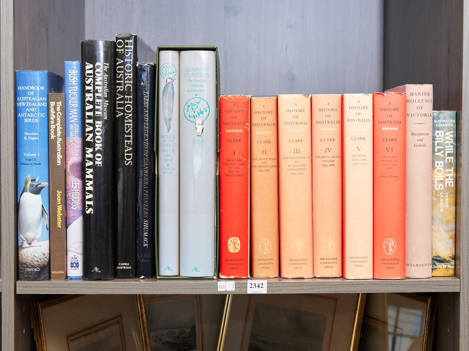 A SHELF OF BOOKS ON AUSTRALIANA INCL. CLARK'S 'A HISTORY OF AUSTRALIA (SIX VOLS.) AND MAY GIBBS, LEONARD JOEL DELIVERY SIZE: MEDIUM