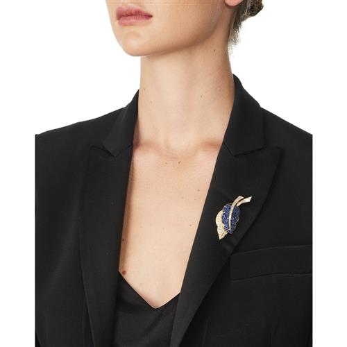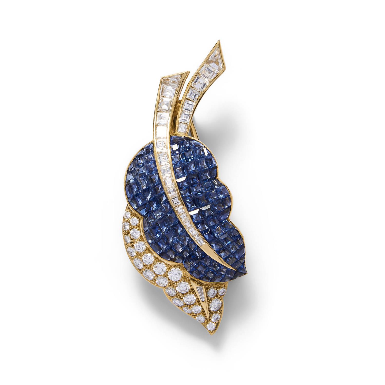 Designed as a foliate spray decorated with custom-cut sapphire, baguette and brilliant-cut diamonds, mounted in 18ct gold, length 67mm, width 23mm, trombone clip fitting.