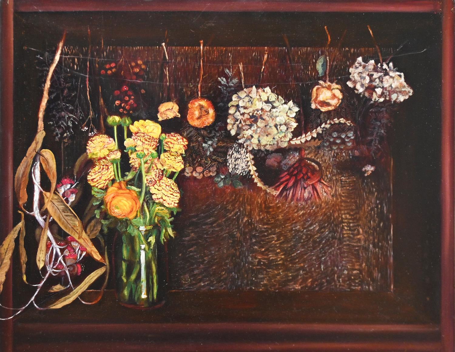 NATASHA BER, STILL LIFE WITH DRY FLOWERS 2019, OIL ON BOARD, SIGNED, TITLED AND DATED VERSO, 40 X 51CM