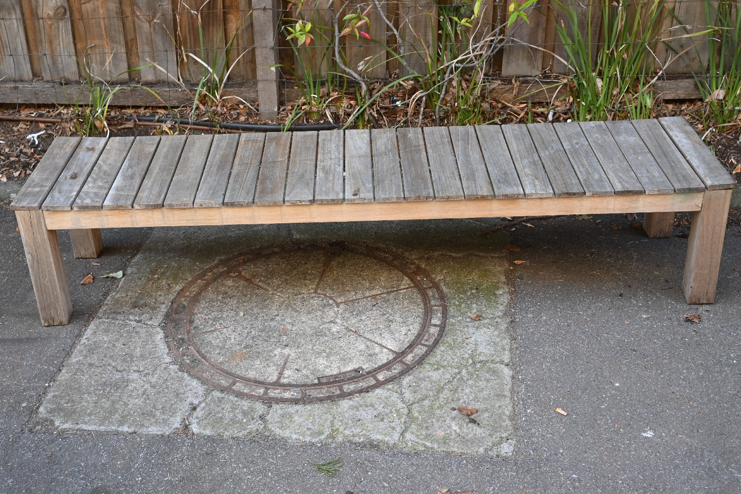 A LARGE TEAK BENCH SEAT (A/F) (40H X 193W X 45D CM) (LEONARD JOEL DELIVERY SIZE: X-LARGE)