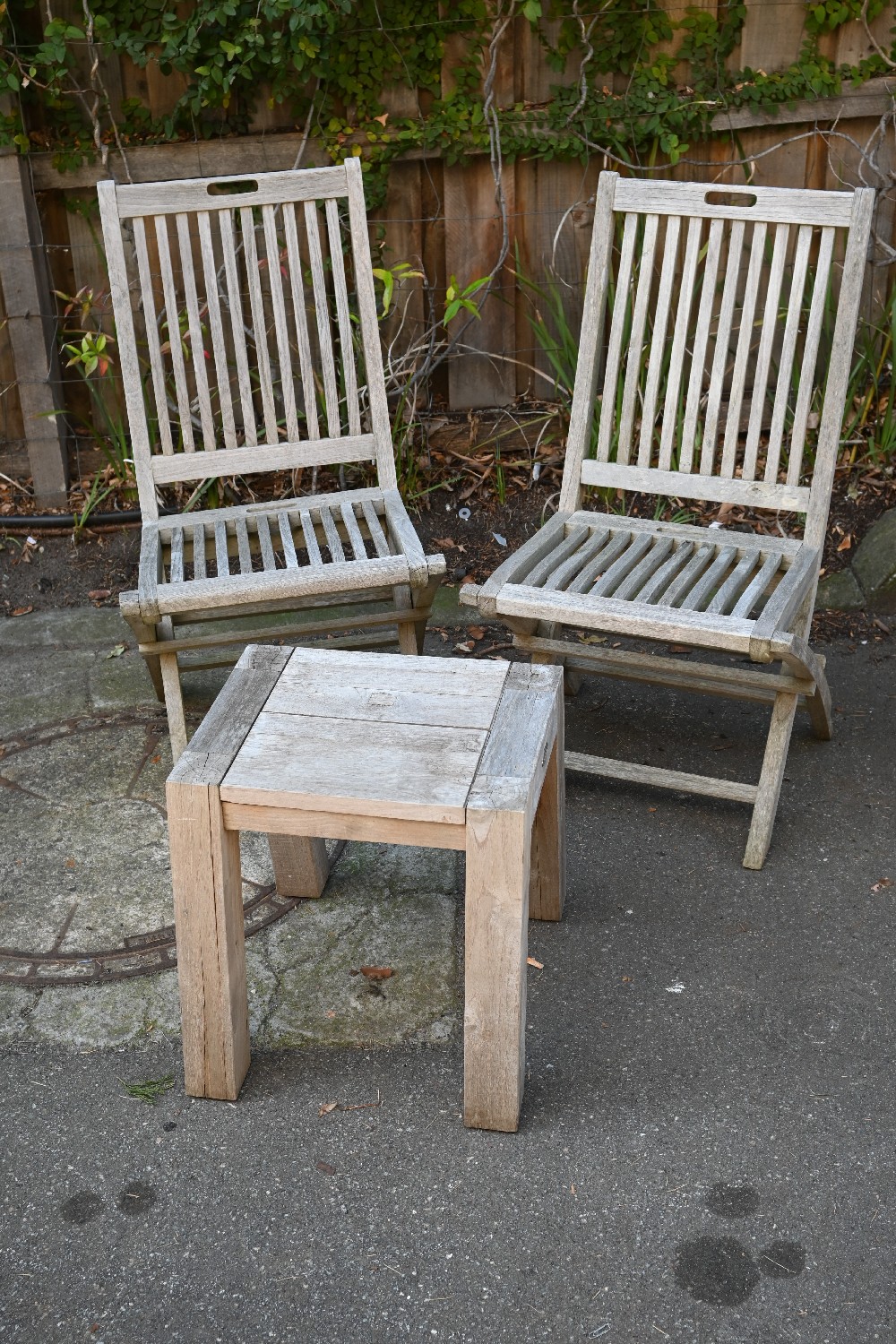 A PAIR OF TEAK FOLDING CHAIRS WITH OCCASIONAL TABLE (A/F) (95H X 50W X 60D CM) (LEONARD JOEL DELIVERY SIZE: X-LARGE)