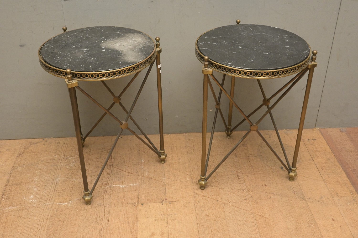 A PAIR OF MARBLE TOP SIDE TABLES (A/F) (57H X 43D CM) (LEONARD JOEL DELIVERY SIZE: X-LARGE)