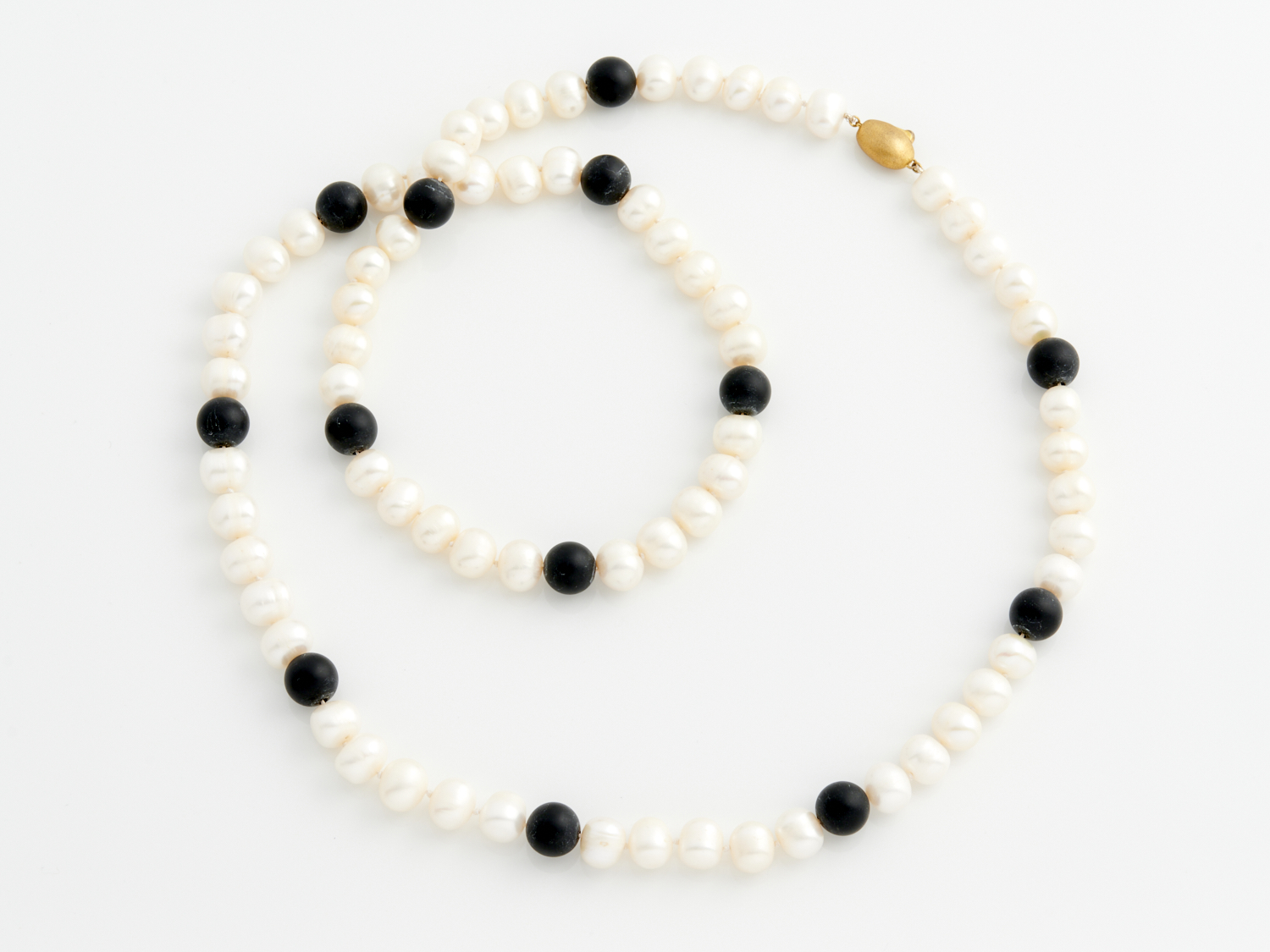 AN OPERA LENGTH STRAND OF FRESHWATER PEARLS WITH BLACK HARDSTONE SPACERS, TO A CLASP IN BASE METAL