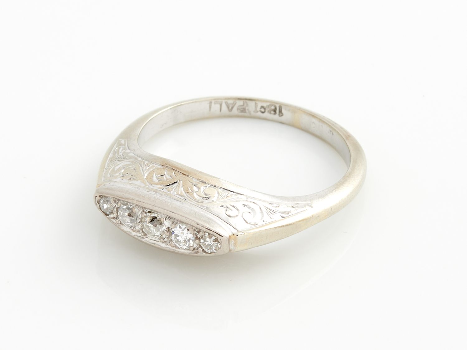 A VINTAGE NAVETTE DIAMOND RING IN 18CT WHITE GOLD, THE OLD CUT DIAMONDS TOTALLING APPROXIMATELY 0.30CTS, SIZE M1/2, 4.3GMS