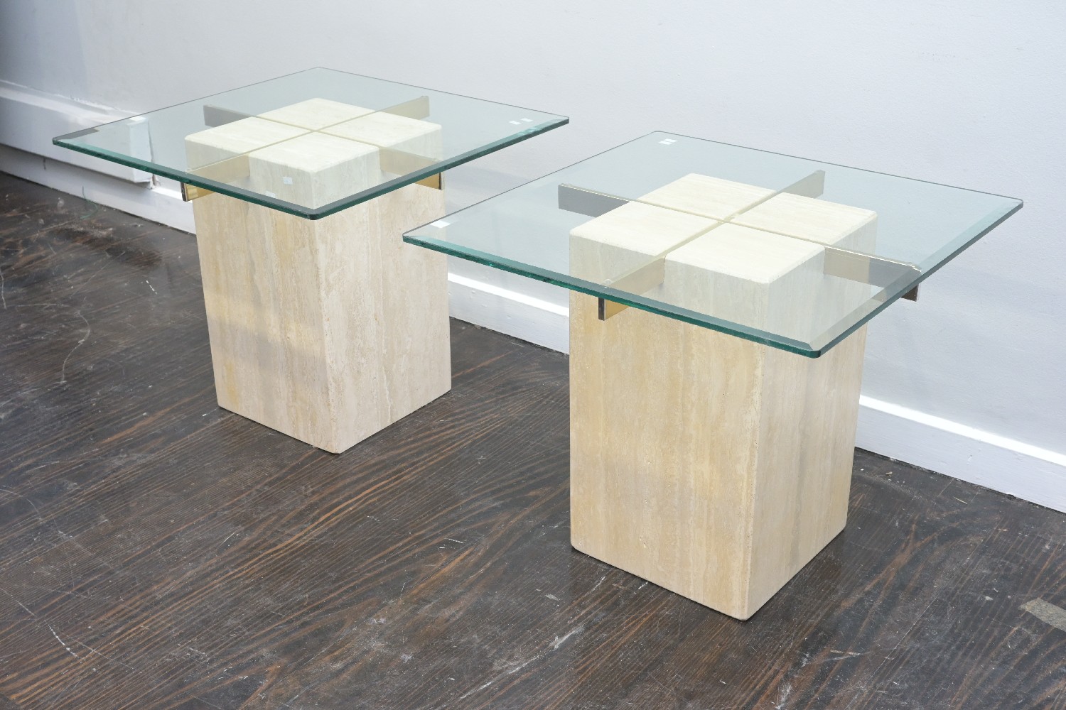 A PAIR OF TRAVERTINE BASED SIDE TABLES WITH A BEVELLED GLASS TOP (55HX 65W X 65D CM) (PLEASE NOTE THIS HEAVY ITEM MUST BE REMOVED BY CARRIERS AT THE CUSTOMER'S EXPENSE. LEONARD JOEL STAFF CANNOT ASSIST CARRYING THIS ITEM) (X-LARGE ITEM)