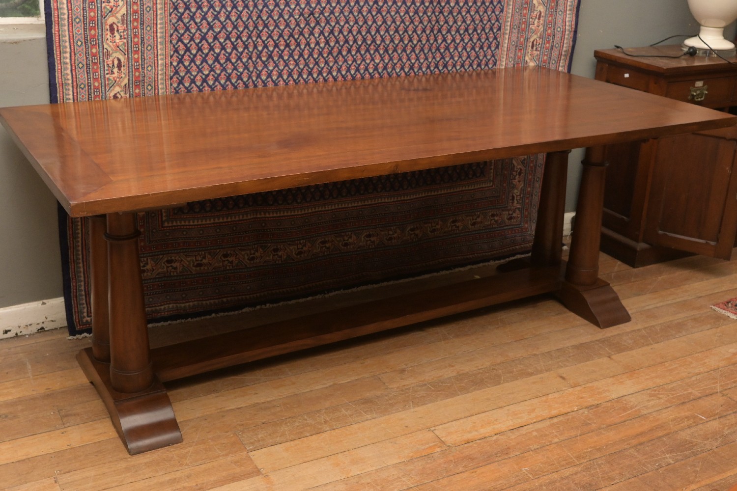 A HARDWOOD REFECTORY-TYPE DINING TABLE ON TUSCAN COLUMN SUPPORTS (A/F) (78H X 207W X 100D CM) (PLEASE NOTE THIS HEAVY ITEM MUST BE REMOVED BY CARRIERS AT THE CUSTOMER'S EXPENSE. LEONARD JOEL STAFF CANNOT ASSIST CARRYING THIS ITEM) (X-LARGE ITEM)