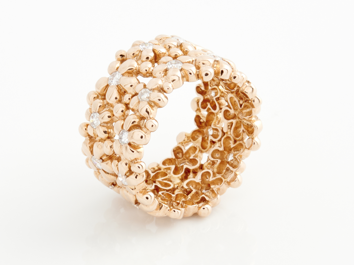 A DIAMOND SET FLOWERHEAD BAND RING IN 18CT ROSE GOLD, SIZE Q, 10.9GMS