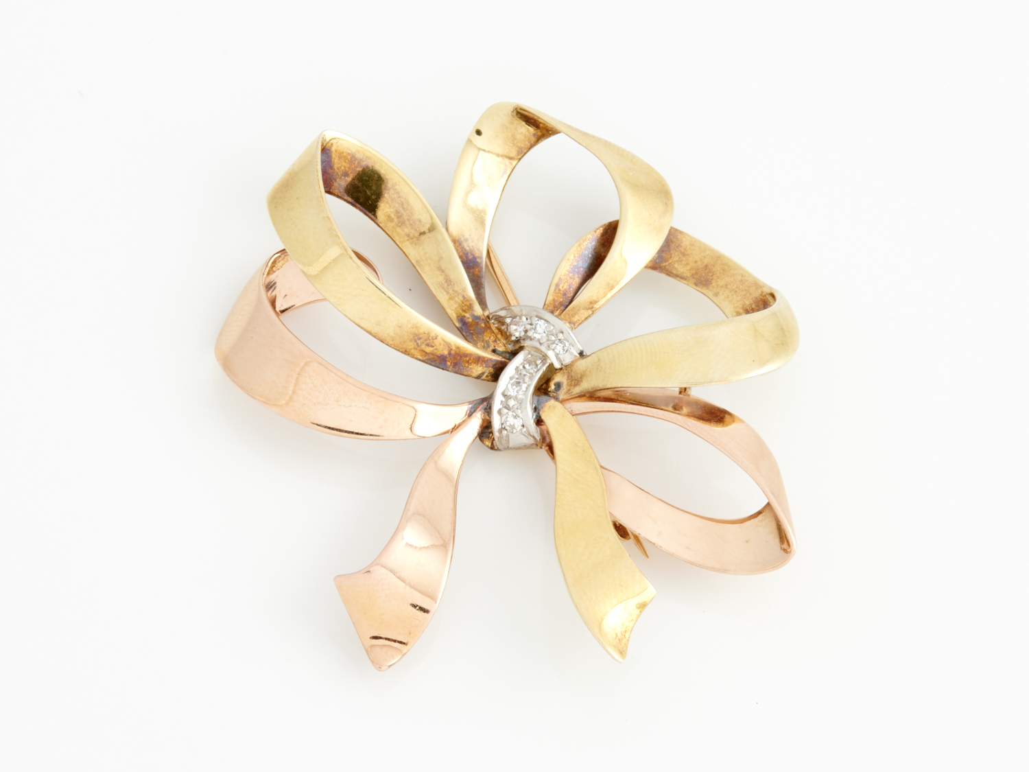 A VINTAGE AMERICAN DIAMOND SET TWO TONE BROOCH STAMPED 14CT GOLD, 50 X 50MM, 11.1GMS