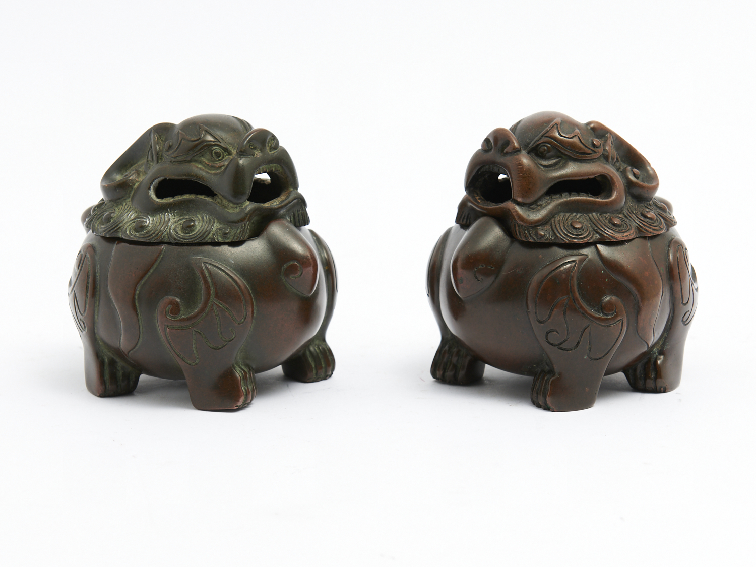 A PAIR OF CHINESE FOO DOG BRONZE CENSERS H.10.5CM (EACH), LEONARD JOEL DELIVERY SIZE: MEDIUM
