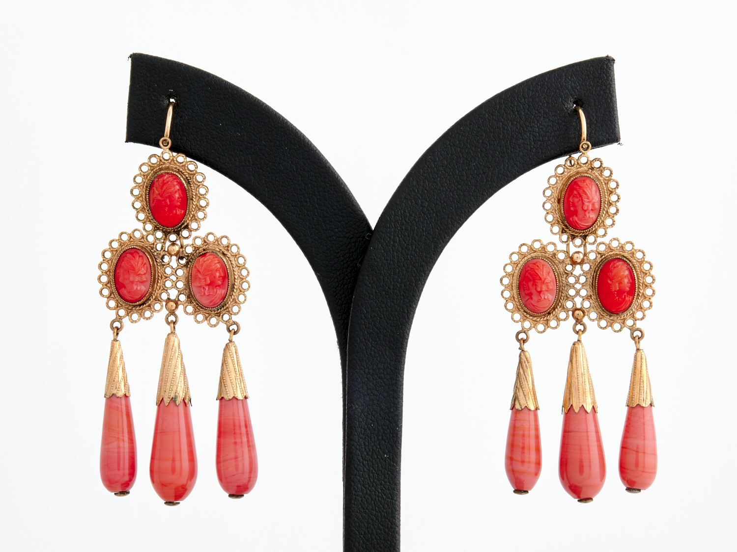 A PAIR OF VICTORIAN ANTIQUE CAMEO GIRANDOLE NIGHT AND DAY DROP PASTE EARRINGS IN GOLD PLATE, TO EUROPEAN FITTINGS