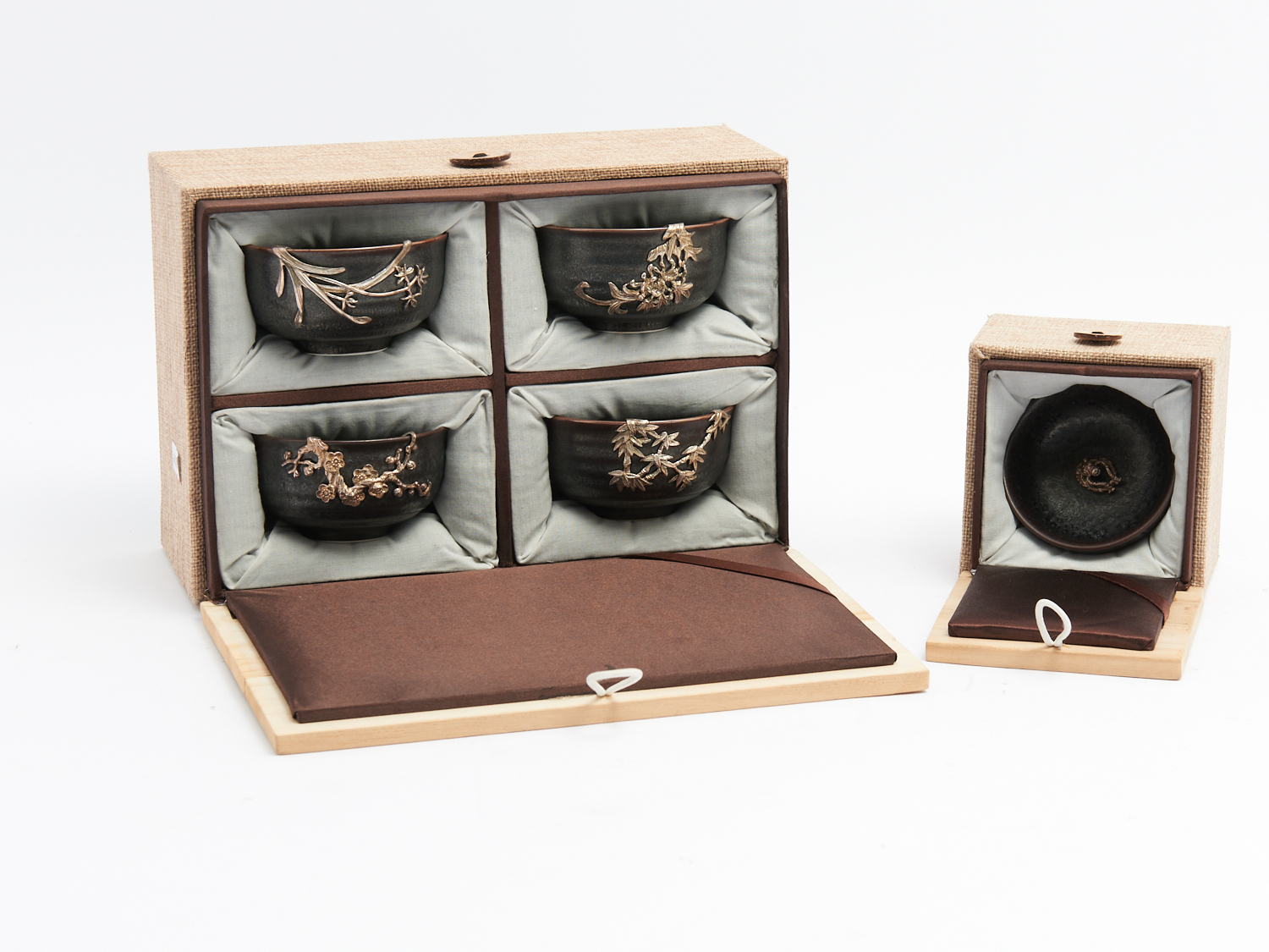 A BOXED SET OF CHINESE BLACK TENMOKU TEACUPS WITH SILVER BOTANICAL MOUNTS, WITH AN ADDITIONAL SIMILAR BOXED EXAMPLE DIA.8.7CM (EACH TEACUP), LEONARD JOEL DELIVERY SIZE: MEDIUM