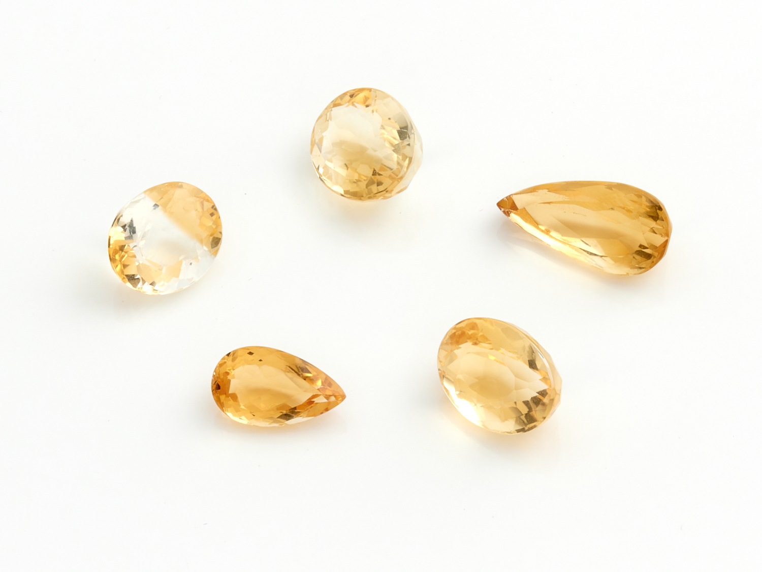 A GROUP OF FIVE LOOSE GEM STONES, INCLUDING THREE CITIRINE