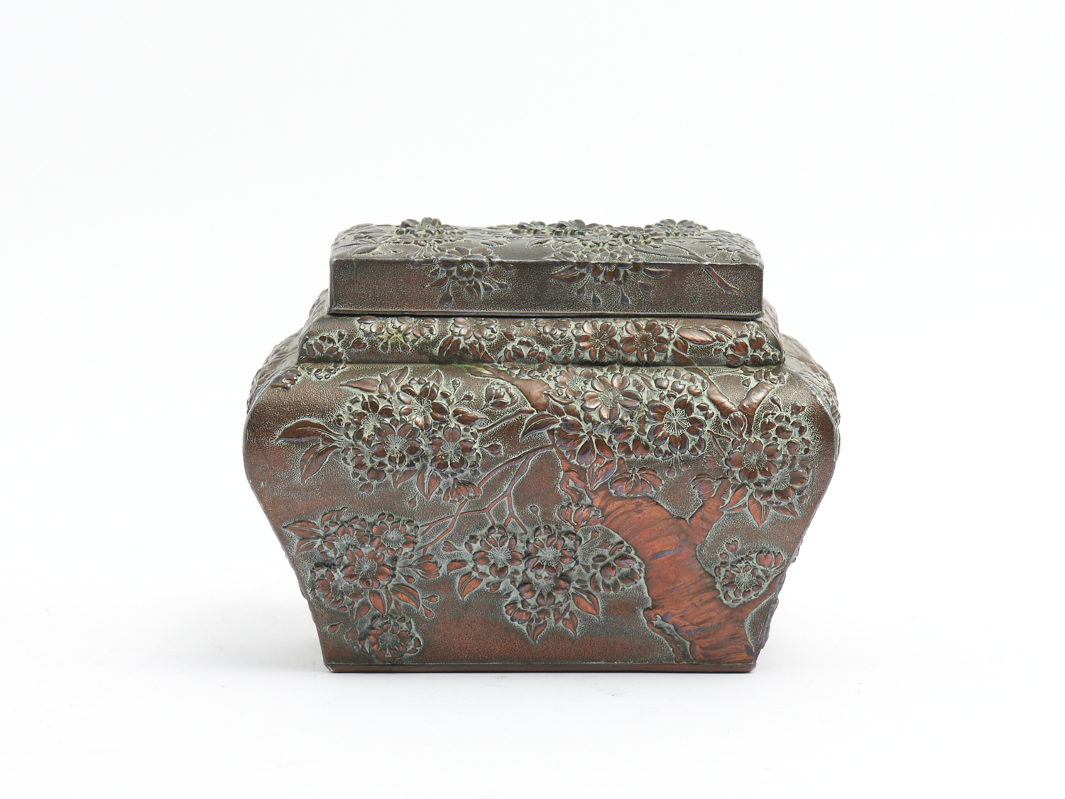 A CHINESE SILVERED COPPER TEA CADDY WITH EMBOSSED BOTANICAL DETAILING L.15.5CM, LEONARD JOEL DELIVERY SIZE: SMALL