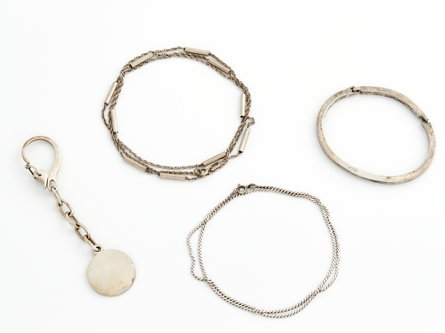 A COLLECTION OF JEWELLERY IN SILVER, INCLUDING TWO NECKLACES, A KEY RING AND A BANGLE