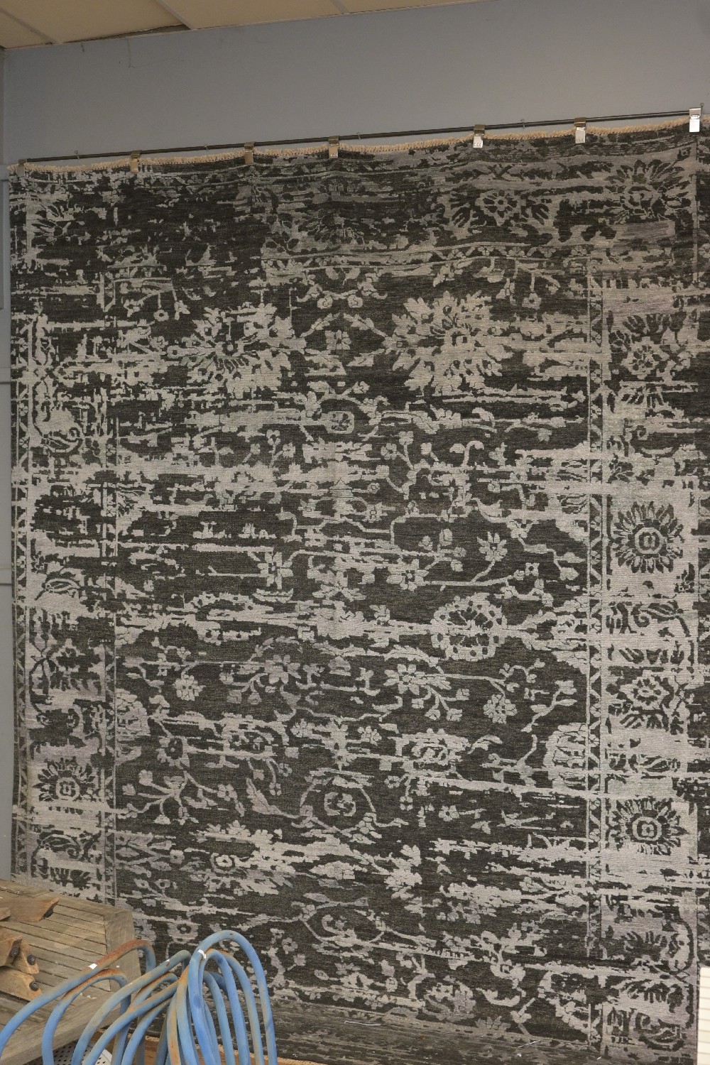 A MODERN CONTEMPORARY TRANSITIONAL HAND KNOTTED CARPET. WOOL AND BAMBOO SILK, IN TONES OF CHARCOAL AND SILVER ALL OVER FLORAL PATTERNS WITHIN THE CHARCOAL FIELD. SIZE: 271 X 349 CM- ORIGIN: INDIA – RRP: $4,900 DOCUMENTATION OF AUTHENTICITY INCLUDED.
