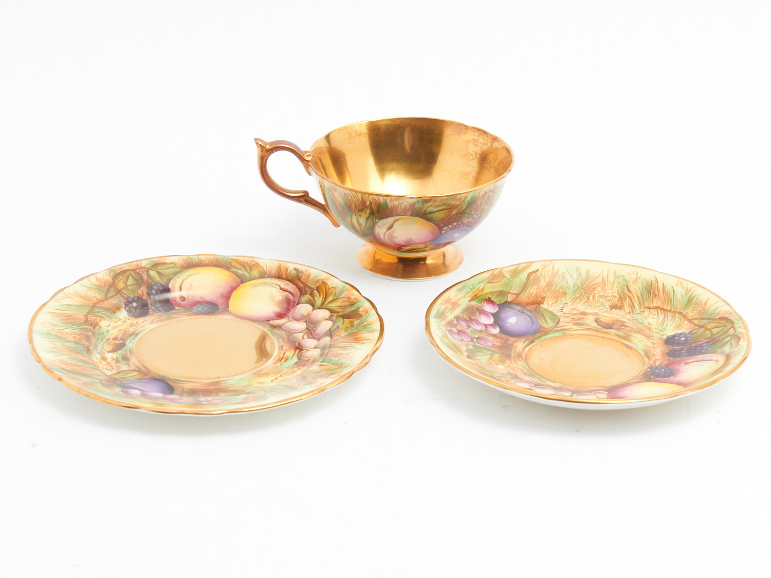 AN AYNSLEY BONE CHINA TEA TRIO WITH HAND-PAINTED FRUIT DECORATION AND GILT DETAILING DIA.16.5CM (DESSERT PLATE), LEONARD JOEL DELIVERY SIZE: SMALL