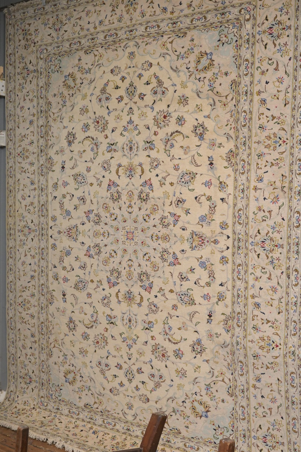 A FINE PERSIAN EX GALLERY IVORY KASHAN CARPET. 100% FINE LAMBS WOOL PILE, VERY SOLID AND DENSE HAND KNOTTED. IN A TRADITIONAL DESIGN OF A BEAUTIFUL CENTRAL MEDALLION IN SOFT BABY BLUE TONES, WITH HIGHLIGHTS OF ROSE AND SAPHIRE BLUE AND LILAC. ON A FIELD OF ALL OVER SHA ABBASI PALMETTES, TENDRILS AND BLOSSOMING FLOWERS. SIZE: 353 X 253 CM ORIGIN: PERSIA – RRP: $5,900 DOCUMENTATION OF AUTHENTICITY INCLUDED.