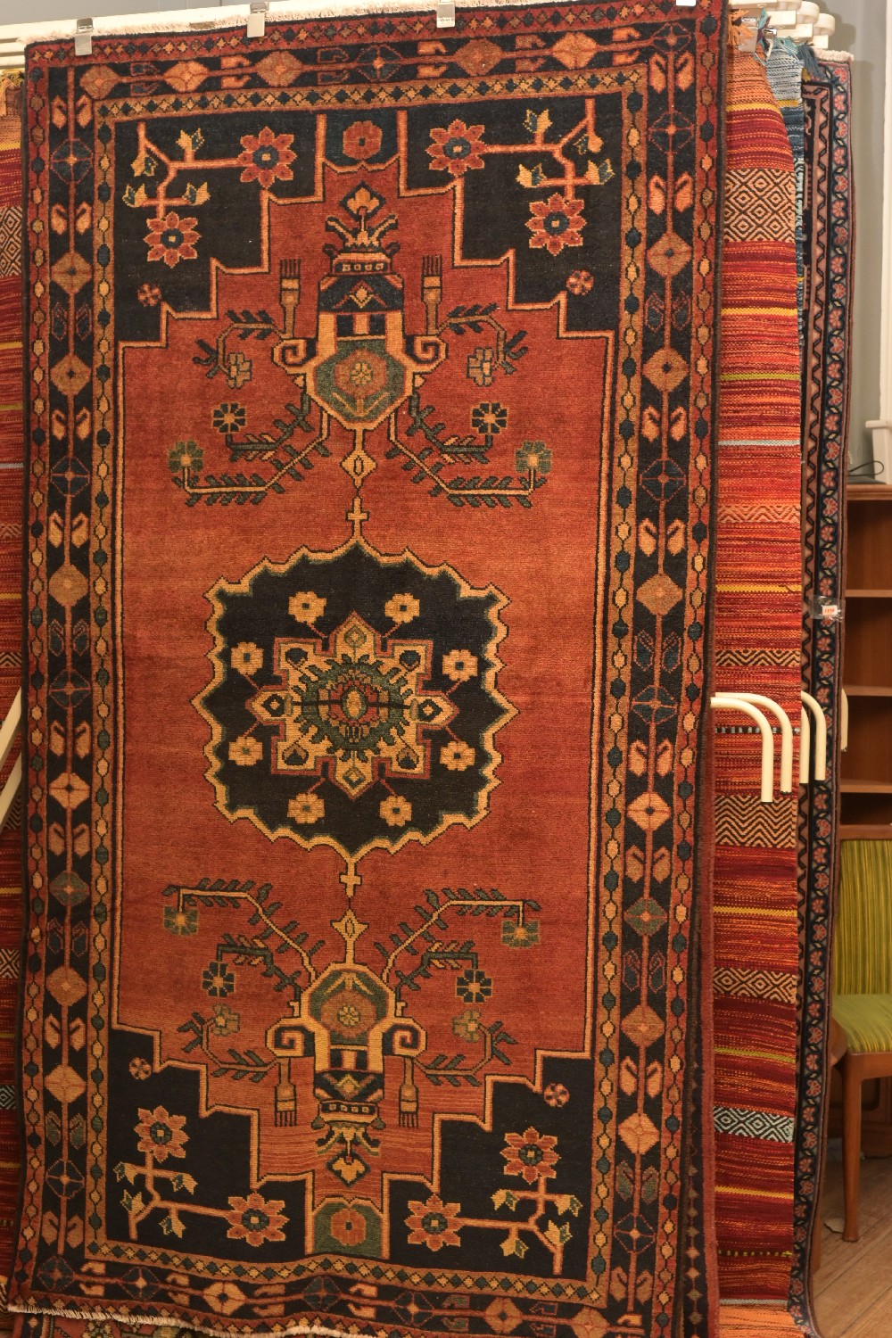 A PERSIAN CHESHMEH RUG, CIRCA 1970'S, 100% WOOL, SEMI VINTAGE PILE. HAND-KNOTTED WEAVE FROM THE HAMADAN PROVINCE, WITH A DESIGN OF CENTRAL FLORAL MEDALLION AND QUARTERED CORNER MEDALLIONS ON A RED TONE FIELD OF TREE OF LIFE AND CHANDELIER MOTIFS. BORDER OF FLORAL AND PAISLEY MOTIFS. SIZE: 240 X 132 CM ORIGIN: PERSIA - RRP: $2,100 DOCUMENTATION OF AUTHENTICITY INCLUDED