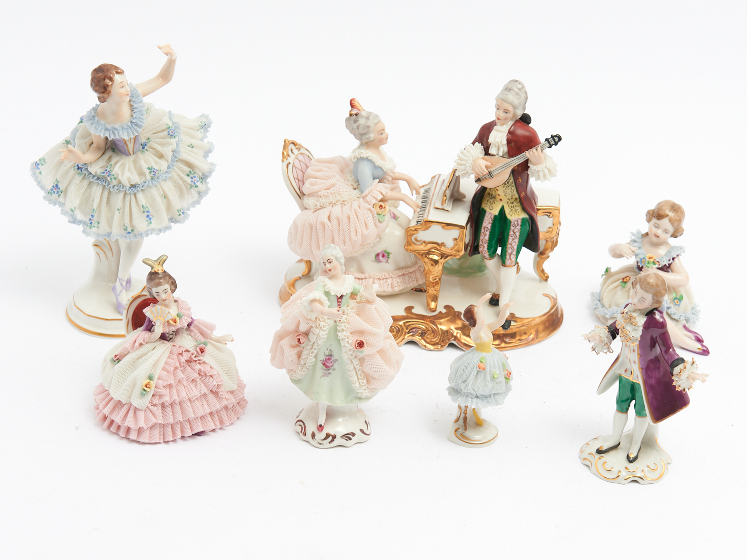 A COLLECTION OF DRESDEN SITZENDORF PORCELAIN FIGURES H.18.5CM (A/F, MINOR LOSSES TO LACE), LEONARD JOEL DELIVERY SIZE: LARGE