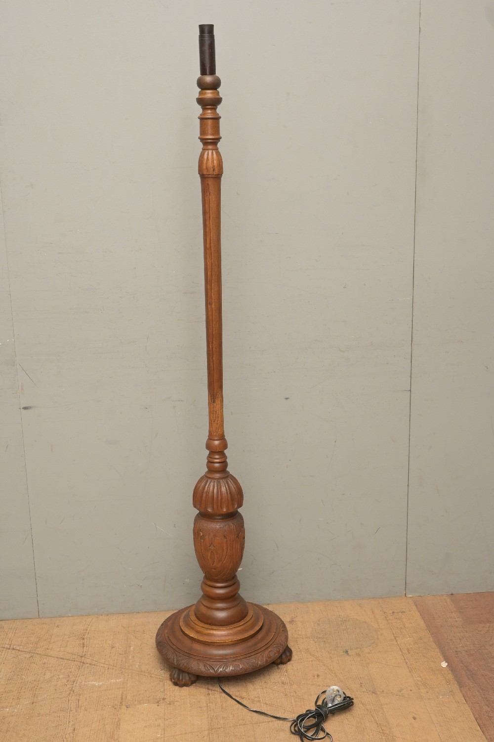 AN ANTIQUE ENGLISH OAK CARVED BASED STANDARD LAMP (165H CM) (LEONARD JOEL DELIVERY SIZE: LARGE)