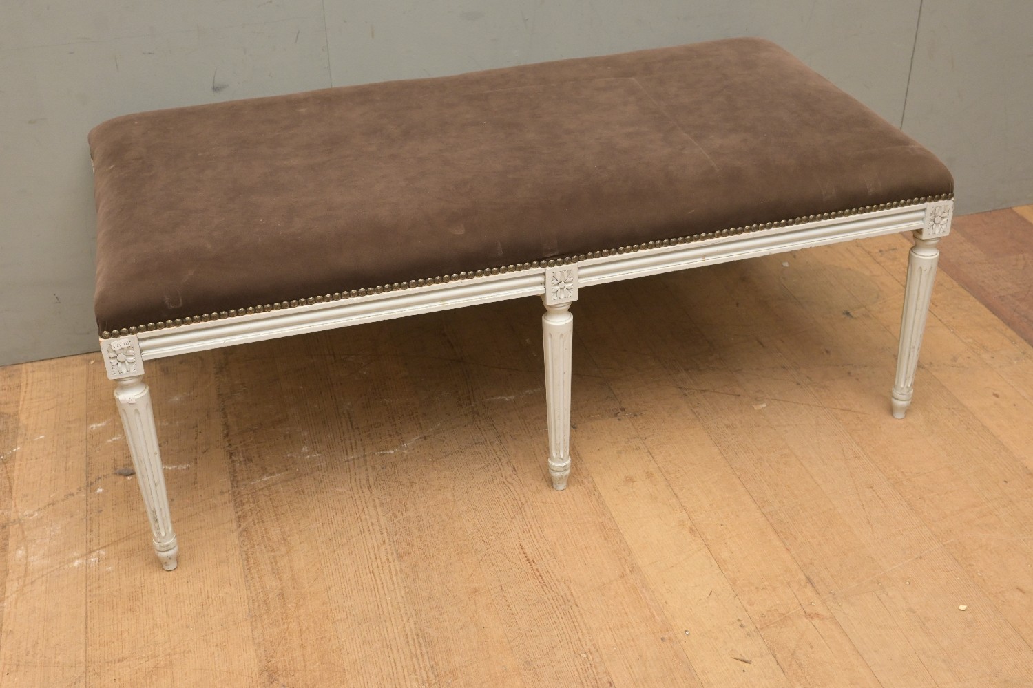 A LOUIS XVI STYLE WHITE PAINTED VELVET UPHOLSTERED OTTOMAN (A/F) (49H X 120W X 61D CM) (LEONARD JOEL DELIVERY SIZE: LARGE)