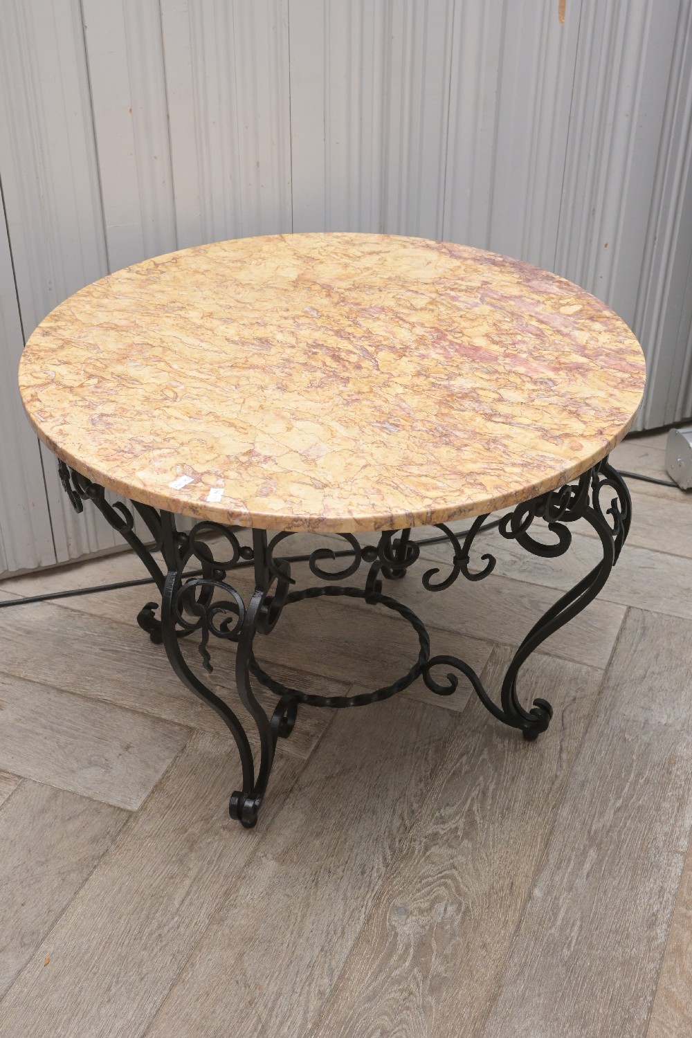 A BLACK WROUGHT IRON BASED CIRCULAR MARBLE TOPPED TABLE (50H X 67DIA CM) (LEONARD JOEL DELIVERY SIZE: X-LARGE)