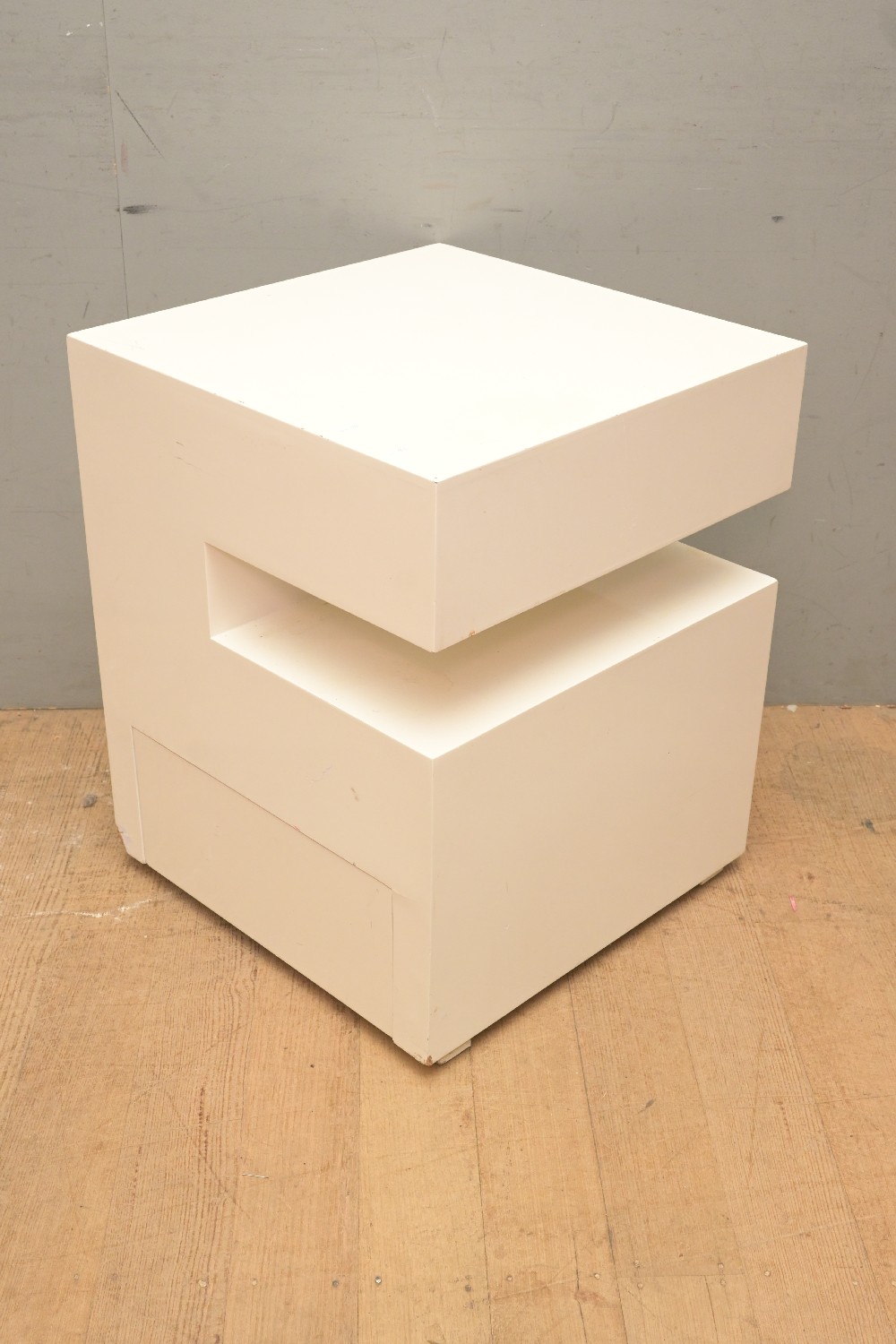 A VINTAGE WHITE WOODEN SINGLE DRAWER SQUARE FORM SIDE TABLE (A/F) (60H X 50W X 50D CM) (LEONARD JOEL DELIVERY SIZE: X-LARGE)