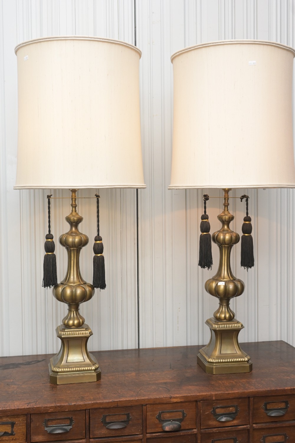 A PAIR OF 1960S BRASS TABLE LAMPS WITH SILK SHADE (103H X 43DIA CM) (LEONARD JOEL DELIVERY SIZE: LARGE)