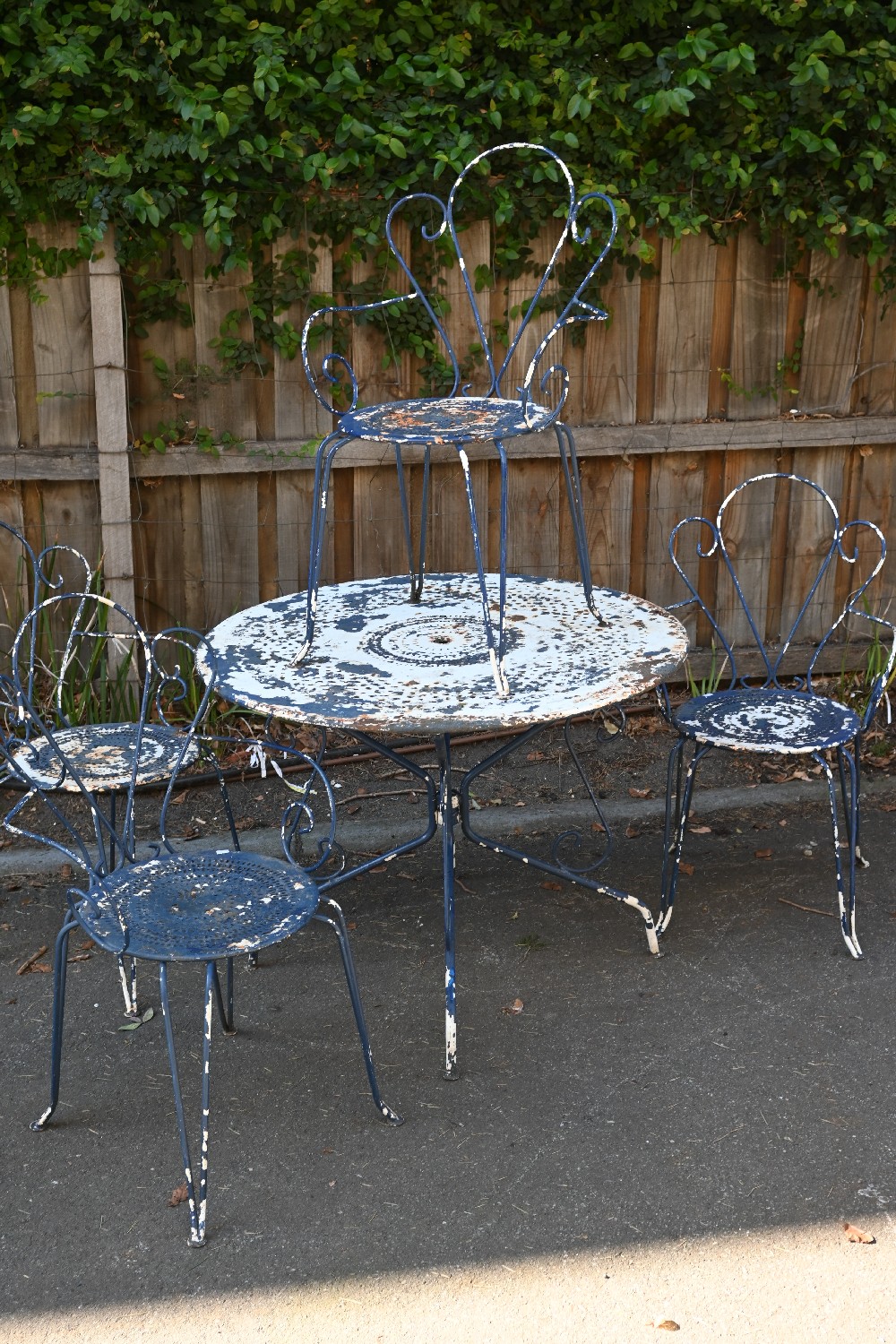 A FIVE PIECE FRENCH WROUGHT METAL OUTDOOR SETTING (A/F) (72H X 97DIAM CM) (LEONARD JOEL DELIVERY SIZE: X-LARGE)