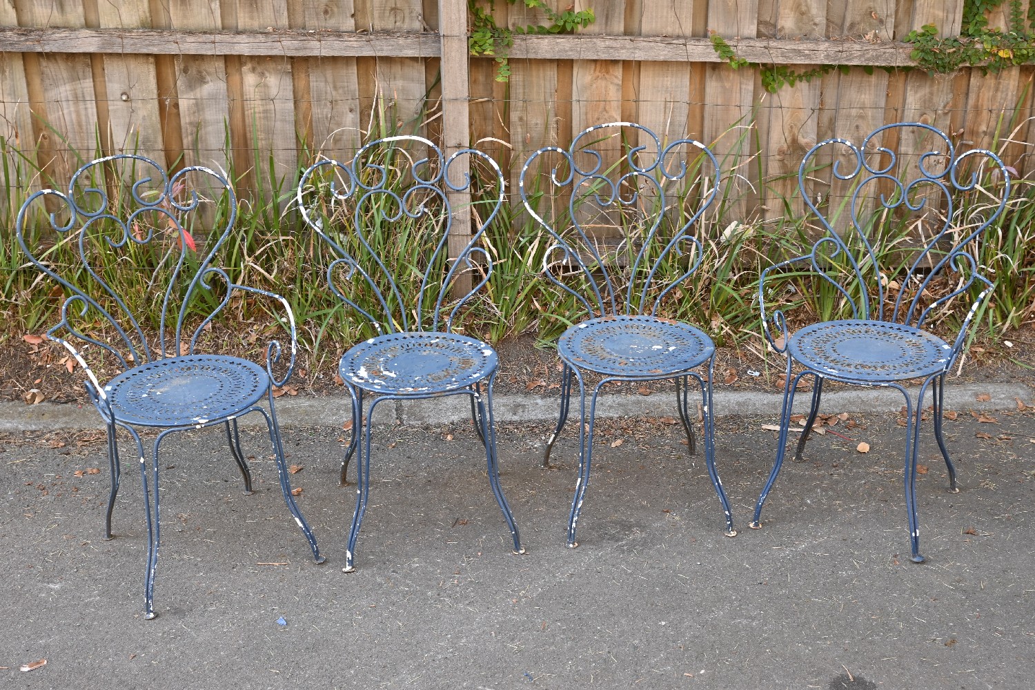 A SET OF FOUR FRENCH WROUGHT METAL OUTDOOR PATIO CHAIRS (A/F) (91H X 51W X 50D CM) (LEONARD JOEL DELIVERY SIZE: X-LARGE)