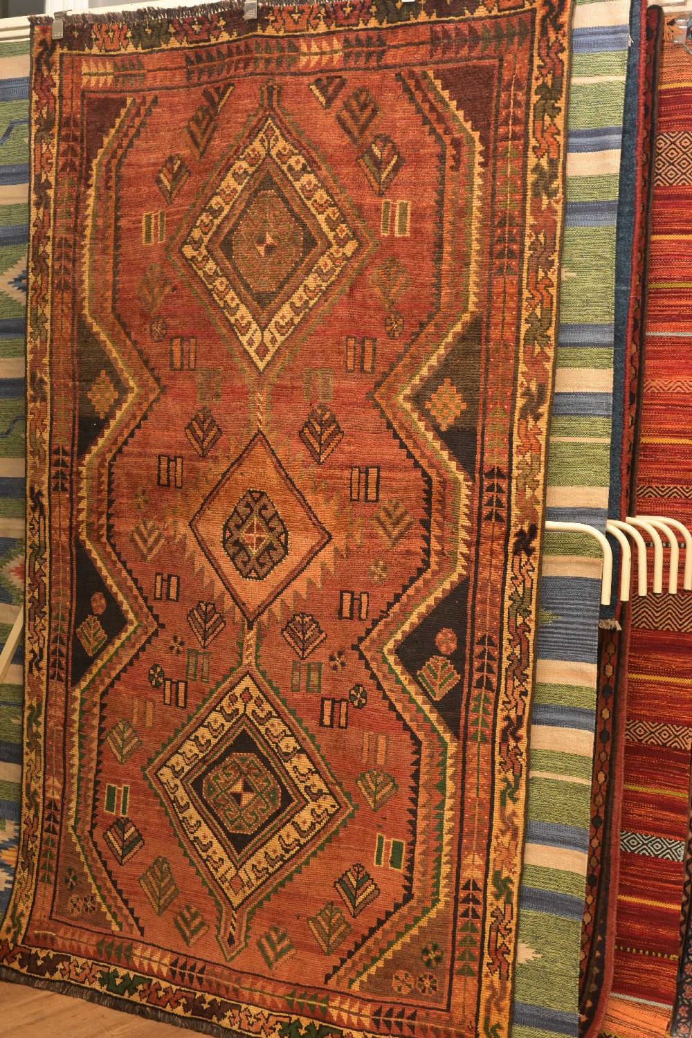 A CIRCA 1970'S PERSIAN TRIBAL KOOHI RUG. 100% WOOL, NATURAL DYES, VINTAGE PILE. DESIGN OF TRIPLE CONTINUING DIAMOND CENTRAL MEDALLIONS CONTAINING AMULETS ON A SOFT RED FIELD OF MINIATURE TRIBAL ROSETTES AND CYPRESS TREES. BORDER OF TRIBAL GEOMETRIC MOTIFS. NATURAL ABRASH. SIZE: 249 X 141 CM ORIGIN: PERSIA - RRP: $1,400 DOCUMENTATION OF AUTHENTICITY INCLUDED