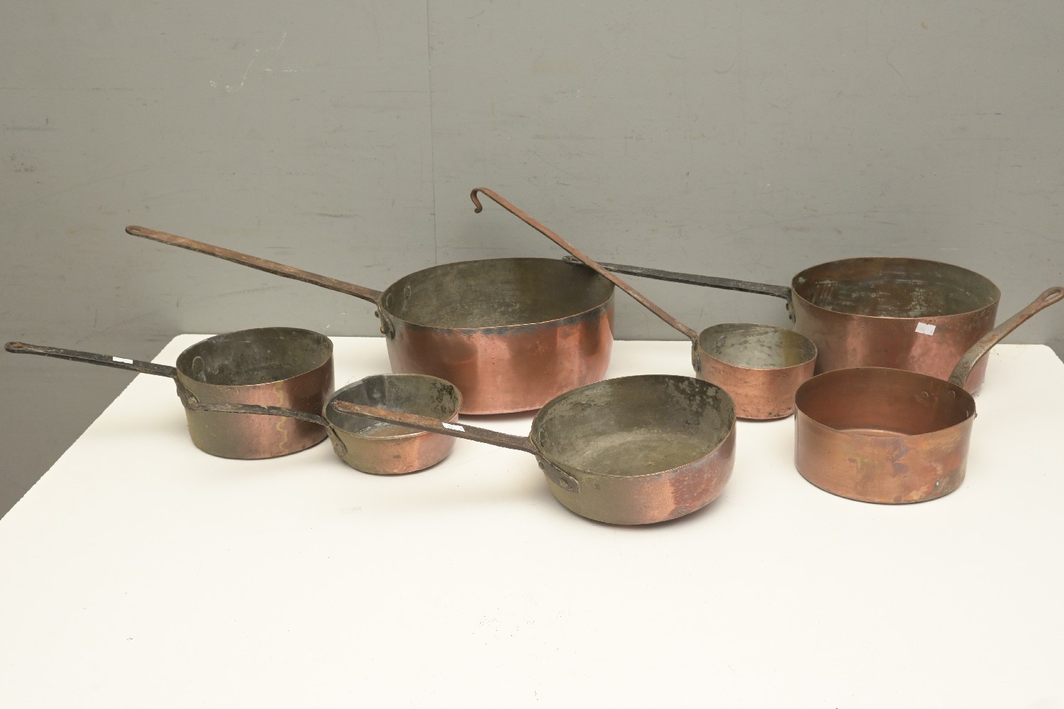 A GROUP OF VINTAGE FRENCH COOKING POTS (A/F) (21H X 62W CM) (LEONARD JOEL DELIVERY SIZE: LARGE)