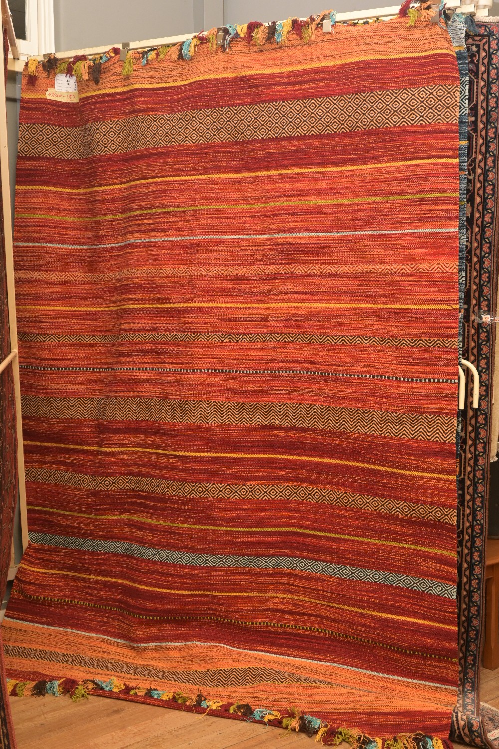A LARGE COLOURFUL, DENSELY HAND- WOVEN RAJASTHANI KILIM RUG. REVERSABLE. MADE FROM THE FINEST COTTON FLEECE. IN RED TONES. SIZE: 200 X 300 CM-ORIGIN: JAIPUR – RRP: $1,300 DOCUMENTATION OF AUTHENTICITY INCLUDED