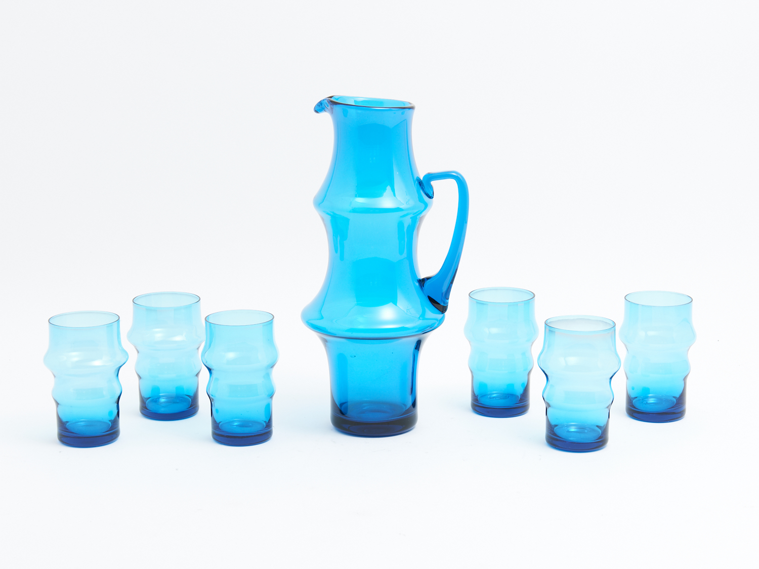 A SWEDISH SEVEN PIECE AQUA BLUE GLASS DRINKS SET H.30CM (JUG), LEONARD JOEL DELIVERY SIZE: LARGE