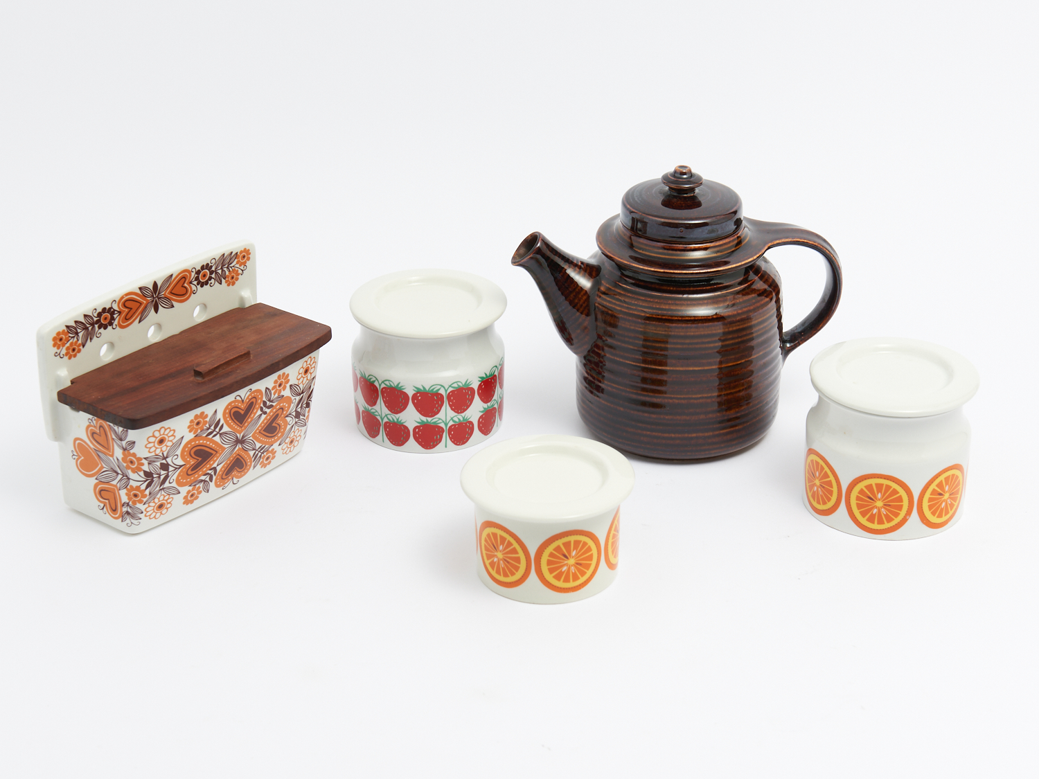 A COLLECTION OF ARABIA WARE INCLUDING A TEAPOT, SALT BOX, AND ORANGE DECORATED CANNISTERS H.18.5CM (TALLEST), LEONARD JOEL DELIVERY SIZE: LARGE