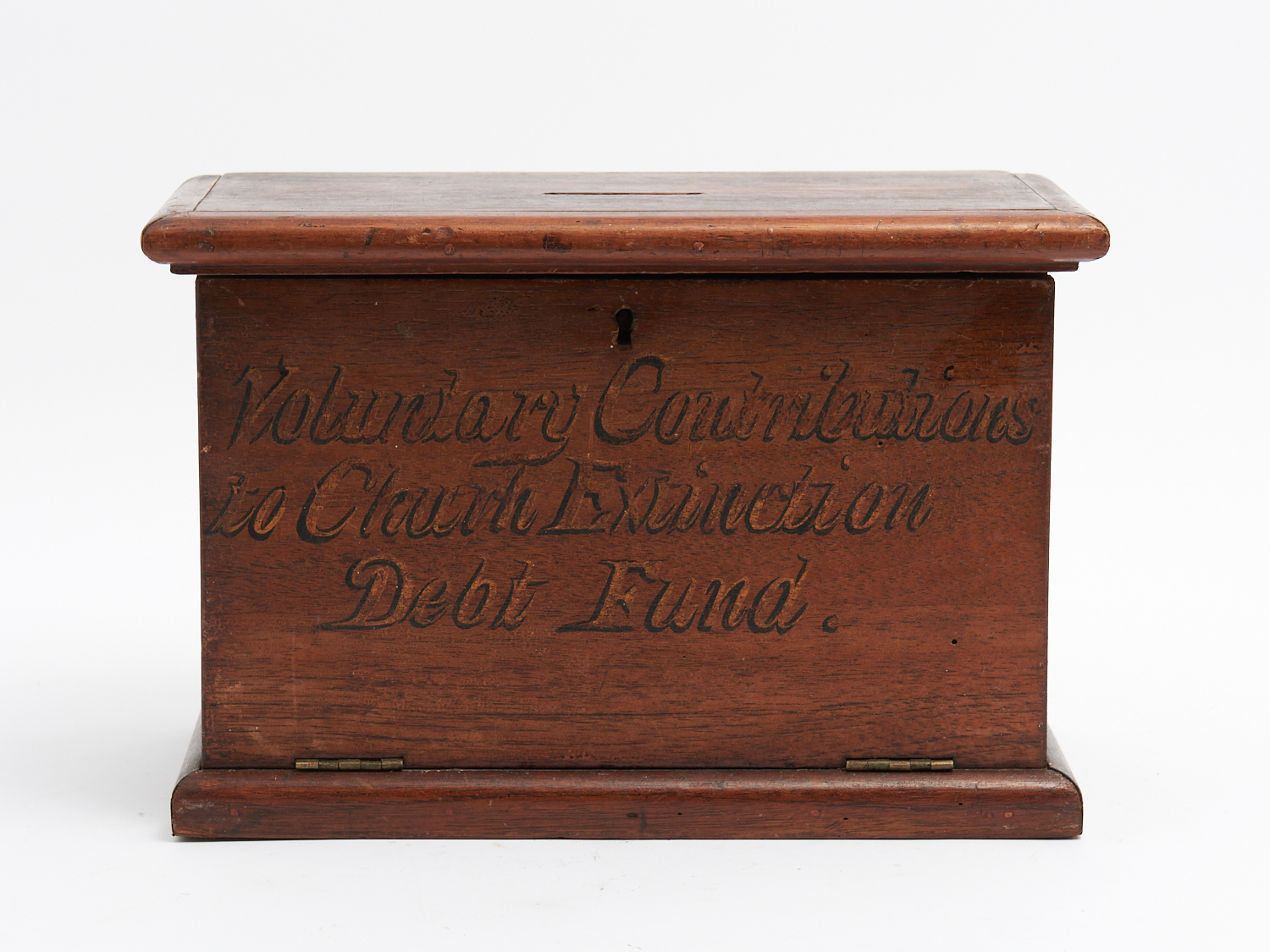 AN ANTIQUE AUSTRALIAN OAK HAND PAINTED VOLUNTARY CONTRIBUTIONS TO CHURCH DEBT FUND BOX W.34CM, LEONARD JOEL DELIVERY SIZE: MEDIUM