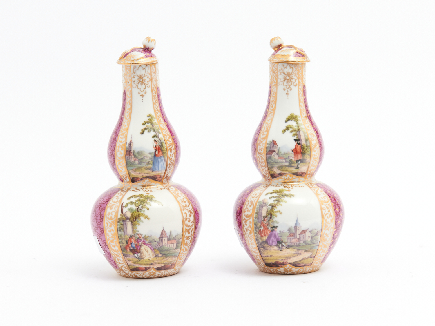 A PAIR OF SIGNED HAND PAINTED EARLY 19TH CENTURY MEISSEN LIDDED URNS H.14CM (EACH), LEONARD JOEL DELIVERY SIZE: MEDIUM