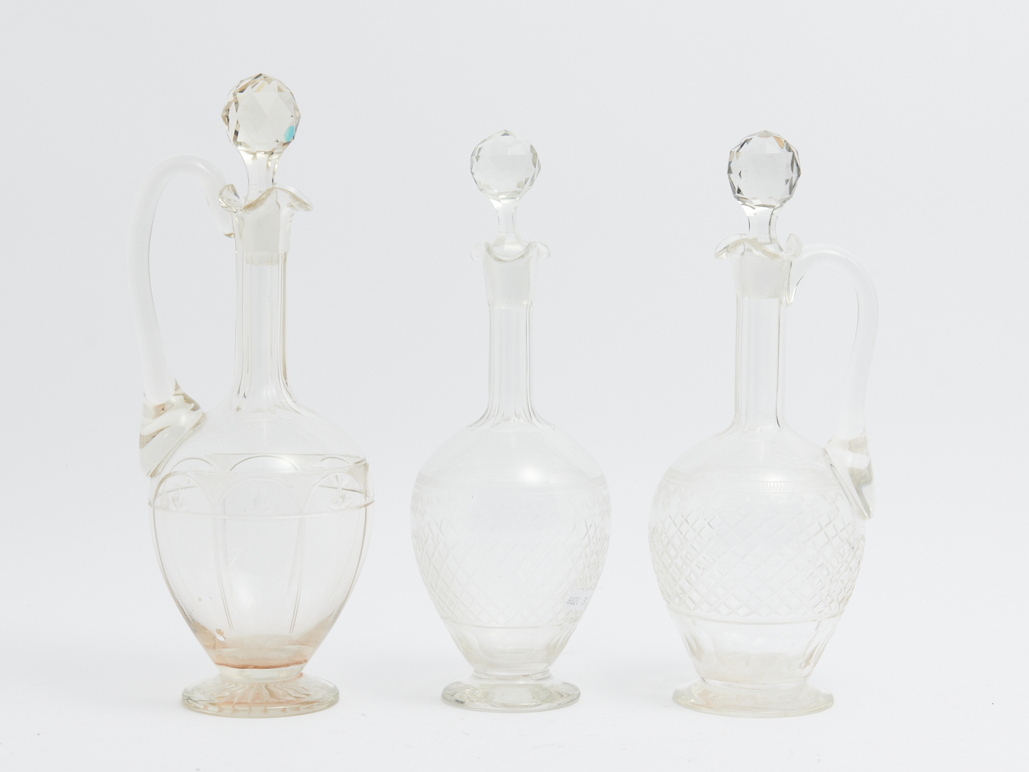 A GROUP OF THREE ETCHED AND CUT CRYSTAL DECANTERS WITH STOPPERSH.33CM (TALLEST), LEONARD JOEL DELIVERY SIZE: LARGE