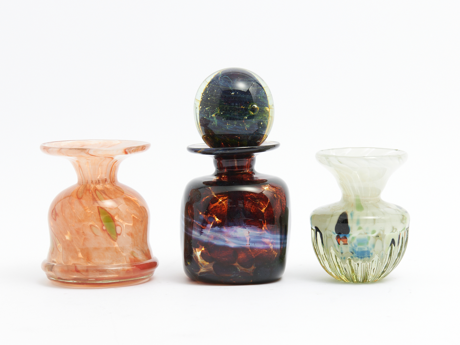A GROUP OF THREE VINTAGE HAND MADE GLASS ITEMS INCLUDING A LIDDED MDINA PERFUME AND TWO OTHERS BY MTARFA H.15.5CM (TALLEST), LEONARD JOEL DELIVERY SIZE: MEDIUM