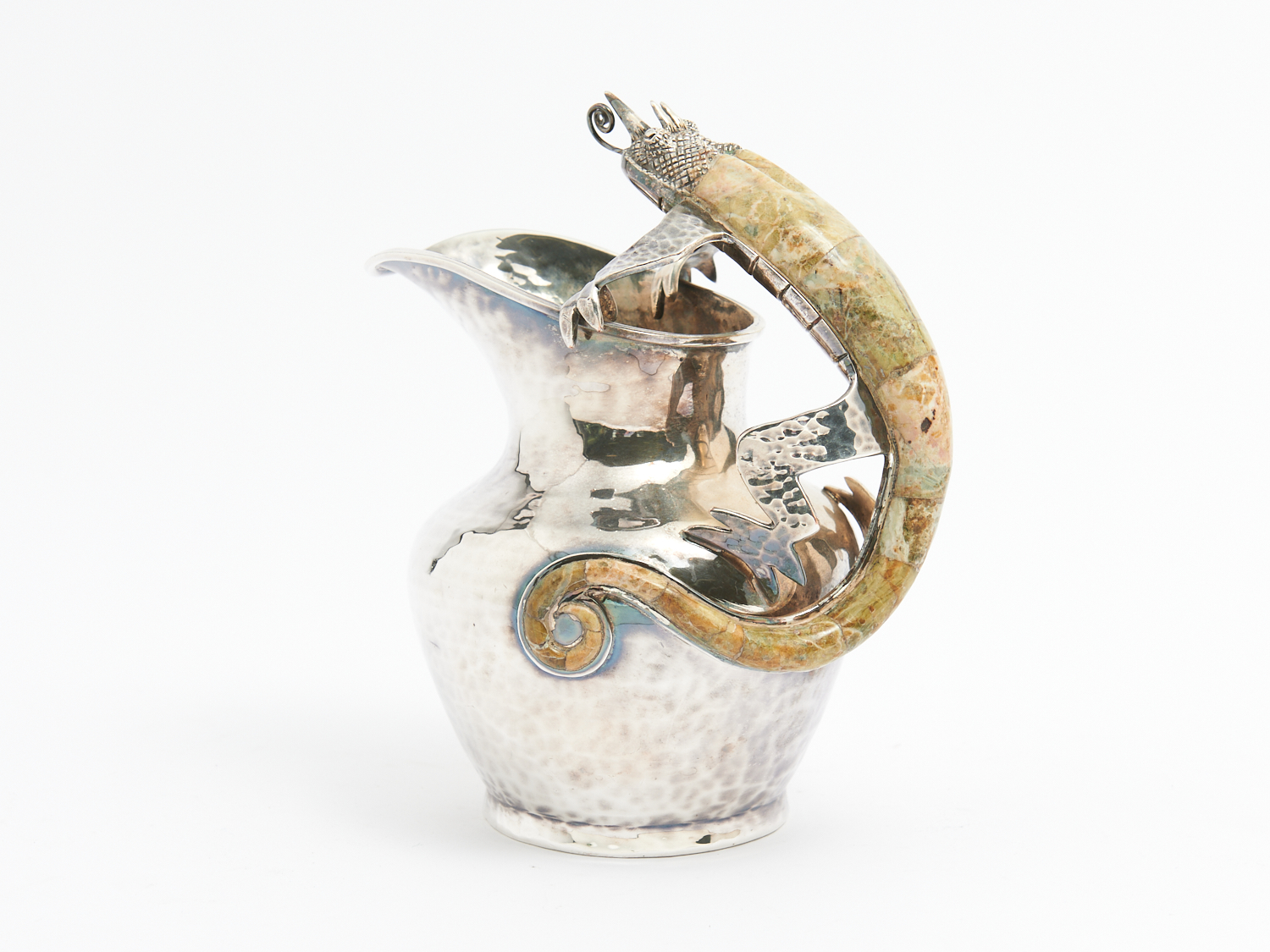 A 1940S MEXICAN SILVERPLATE STONE SET LIZARD JUG BY WOLMAR CASTILLO SILVERSMITHS H.20CM, LEONARD JOEL DELIVERY SIZE: SMALL
