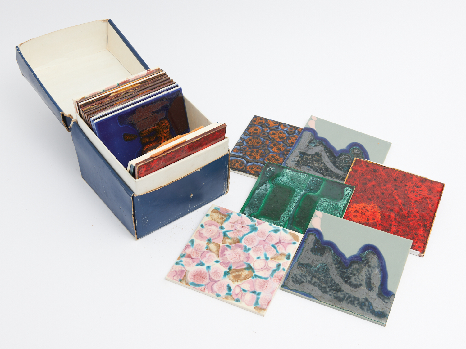 A BOXED SET OF 18 MID-CENTURY VILLEROY AND BOCH METTLACH GLAZED TILES 15 X 15CM (EACH TILE), LEONARD JOEL DELIVERY SIZE: SMALL