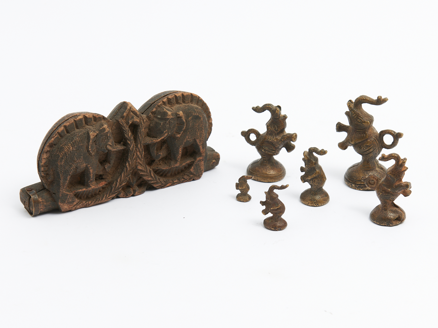 A GRADUATED SET OF SIX ANTIQUE BRONZE ELEPHANT FORM OPIUM WEIGHTS AND MATCHED SCALES IN CARVED WOODEN CASE L.16CM (CASE), LEONARD JOEL DELIVERY SIZE: SMALL