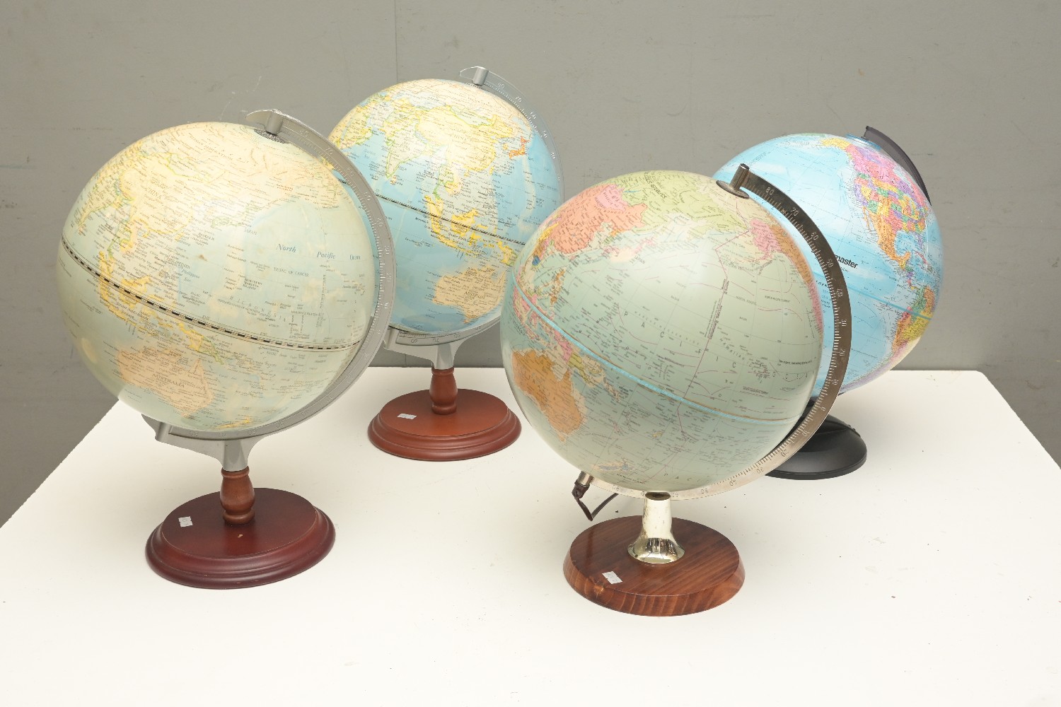 A COLLECTION OF FOUR VINTAGE WOODEN AND METAL BASED AND FRAMED WORLD GLOBES INCLUDING AMERICAN DANISH AND ONE LIGHT UP (35D CM) (LEONARD JOEL DELIVERY SIZE: MEDIUM)